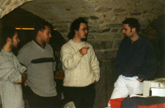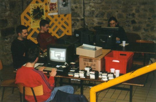 Prenez une cafétéria (médiévale si possible). Versez-y une vingtaine de CPCistes. Ajoutez au moins autant de visiteurs. Mélangez Enfin, saupoudrez le tout de Nesquik. Ca y est, vous pouvez déguster.Contrairement à l'année dernière, l'événement avait correctement été annoncé dans les journaux locaux. Malgré tout, il n'y a pas eu beaucoup plus de visiteurs qu'à la précédente édition. Peu importe la quantité, du moment qu'ils soient intéressés. Et ils l'étaient! Les participants arrivés la veille se sont retrouvés une fois de plus à la pizzeria. Cette année, pas d'enfumage intempestif, mais un sérieux problème de monnaie pour le serveur (8 personnes qui payent leur pizza avec un billet de 200F chacune, imaginez le cauchemar!). L'installation du matériel ne pu se faire qu'une fois la salle du meeting ouverte, et ce ne fut pas une mince affaire. Après un quart d'heure, Eliot est enfin parvenu à ouvrir la porte, mais il fallut se résoudre à laisser les clefs dans la serrure toute la nuit... démonstrations multimédia L'organisation des "stands", présentant les diverses facettes du CPC, n'avait pas tellement changé. Tous les CPCistes étaient réunis au coin démomaking ("Ah bon, y'a autant de démomakers que ça sur CPC?" comme dirait Ramlaid) sauf quelques-uns qui décidèrent de s'isoler dans les méandres de la cafétéria. De la fiche technique des différents modèles de CPC au stand démomaking, en passant par la table où étaient exposés les fanzines (Amslive, Quasar, Another World), sans oublier le réseau, tous les visiteurs semblaient comblés. Je me souviens encore de ces 5 personnes jouant au Shoulder Dash jusqu'à 2 heures du matin ! Certains visiteurs connaissaient déjà de loin la scène CPC, à l'instar de ce jeune quidam auquel la CPCISA n'était pas étrangère. Celui-ci n'a d'ailleurs pas décroché du CPC+ d'iron, ce dernier lui conseillant toujours un jeu encore meilleur que le précédent. Par contre, cette année, il n'y avait pas de secteur dédié au hardware. Cela ne nous a pas empêché de présenter la Soundplayer et la Ramcard aux intéressés. En revanche, Eliot a passé pas mal de temps à préparer des cables 3.5" et quelques Ramcard ont été montées par Ram7.