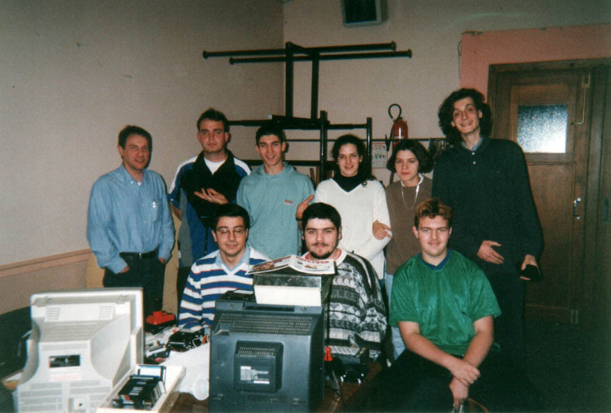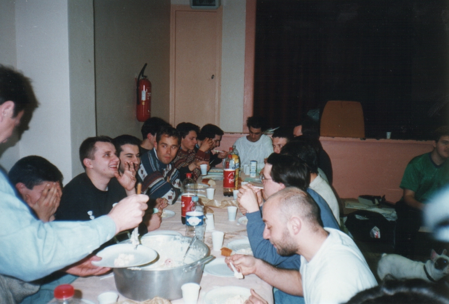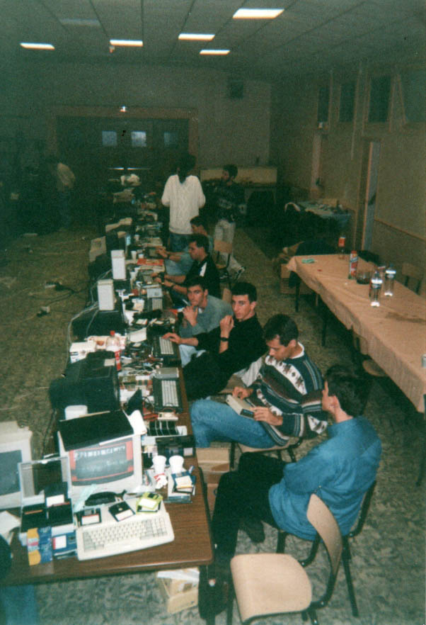 Après avoir successivement invité chez lui 3, 3 et 9 personnes, Eliot a décidé de voir plus grand pour la 4ème édition du CAMEMBERT. Sa chambre était trop petite, alors la salle des têtes de CLAR13EC (prononcez Clarrrrrrbeuk) fut mise à contribution (pour cette salle, c'était surtout le portefeuille qui Fut mis à contribution !).Le comité d'accueil taisait aussi office de tourisme. On a pu étudier la météo locale, l'organisation communale (par exemple les réverbères qui s'allument quand vient le jour) et avoir au petit déjeuner du vrai lait de vache et du beurre dur (ou semi-tendre, je ne sais plus). MEETING POT Cela taisait longtemps qu'il n'y avait pas eu un meeting non-estival. Pourtant, un week-end en période de vacances scolaires permet à plein de gens d'horizons différents de se rencontrer. Les chiffres parlent pour eux-mêmes : rarement il y avait eu autant de CPCistes réunis, il n'y avait plus assez de place pour brancher tous les ordinateurs. La salle était pourtant grande, mais les tables pas assez nombreuses, ce qui engendrait d'ailleurs une véritable cohue lors des repas. Heureusement que certains se contentent de peu de nourriture. Tant que j'y suis, petit message perso à Eliot : ce n'était pas très gentil de choisir une nappe et des serviettes rose saumon juste pour rappeler de mauvais souvenirs à notre SIOU national. Je reviens à la diversité de ce meeting : les vieux de la vieille, les baroudeurs intrépides côtoyaient d'autres "anciens" du CPC, mais dont c'était le premier meeting, et des nouveaux venus sur la scène CPC. LE FAUCHAGE Imaginez le dilemme pour Eliot : on ne pouvait pas allumer le chauffage et le réfrigérateur en même temps sous peine de faire sauter les plombs. Mais s'il n'y a pas de chauffage, pas besoin de frigo. En fait, rien n'a été branché pour préserver tout le monde de coupures malencontreuses. La chaleur humaine se chargeait de compenser le manque de degrés. Non non il ne faisait pas froid, mais merci quand même à Roudoudou pour son sac de couchage conçu pour les expéditions polaires. LE + A L'HONNEUR Un tiers de la quinzaine de CPCs étaient des PLUS. Les parties de l'ASIC INSIDE présentées étaient impressionnantes (feu, plasma sur plusieurs plans, déformations en zoom avec 3 D en avant plan...). Malheureusement, les auteurs respectifs n'étaient pas tous là, et nous n'avons pas eu le droit aux plus récentes versions. Pour cette même raison, le SOUNDTRACKFR DMA . Va pas dévoilé toute sa puissance, et les sons "SID" manquaient à l'appel. Par contre, les digidrums marchent très bien ! Le Claudia BMP Converter d'Eliot donne des résultats excellents sur +, quoiqu'ils soient aussi très satisfaisant sur non-plus. Il y en avait même pour dire que la version sur CPC "old génération" n'était pas plus mauvaise sur certains dessins. Par contre, un dégradé de 16 couleurs étant très difficile à obtenir avec la palette standard, l'acquisition vidéo en mode 0 prend toute son ampleur avec 16 niveau de gris. Ceci dit, quelque soit le CPC, c'est ELECTRONIQUE Electro/Jack, dont ses lecteurs 3.5" et 5.25" sont placés dans une tour, nous a gratifié d'un casse tête électronique très plaisant. A première vue, de simples boutons poussoirs et lampes, mais qui ne réagissaient pas comme prévu (bravo à Sitting Bug qui a presque tout deviné). LES PREVIEWS RAM LAID a commencé une démo spécialement pour le meeting, avec plusieurs modes graphiques sur une même ligne et des effets basés sur une rupture ligne à ligne. Candy nous a montré la partie principale d1 "Esctasy", comportant un joli woobler, et la partie de fin. Targhan a apporté un rotozoom, qu'il a essayé d'optimiser pendant une bonne partie du meeting, mais aussi, dans le cadre de sa perpétuelle compétition avec SQUAT, une routine de scroll transparent 3 fois plus rapide que celle de ce dernier. Mais celui-ci rispota avec de superbes (mais petits) effets de plasma ou de sinus XOR et sa routine de scrolling zoomant à gogo. SHAP a présenté un plasma très paramétrable, avec entre autres une option "entrelacé" pour simuler 2 plans. Il faut ajouter à cela ce qu'on a pas vu (les parts secrètes de DEMOIZART...), ce que je n'ai pas vu, et ce que j'ai oublié. NOODLES Non, pas de commentaires. LE RESEAU Bien entendu, on s'est de nouveau éclaté sur LAP et SHOULDER DASH, surtout qu' OFFSET avait apporté beaucoup de cartes réseau. Ce dernier a proposé de programmer un nouveau jeu réseau, même simple. C'est une très bonne idée, mais qu'on a pas eu le temps d'appliquer pendant ce meeting. D'ailleurs c'est un meeting qui est passe trop vite ; je n'ai pas eu le temps de taire le dixième de ce que je voulais. A quand les 9 autres Camembert LE MATOS Sur une table à part étaient disposés : les VIRTUAL NETCARD (et SOUNDPLAYER avec) sus-cilées, les numéros 4 à 14 de Quasar, les numéros 5 a 7 d'AMSLIVE itou, et des questionnaires EUROSTRAD (TOM POUCE à t'ait le plein d'adresses au meeting, et l'annuaire EUROSTRAD devient très important). Au pied de la dite table, les fameux kits 3.5". Bon point, avec cette vente directe : pas de frais postaux à payer, le transport est plus sûr, l'acheteur peut tester immédiatement et être aidé en cas de problème. C'est quand même mieux que DARTY ! Bien sûr, ça oblige certains à porter de louuuurds cartons, mais on a rien sans rien. L'AMBIANCE N'étant pas d'un naturel comique, je passerai sous silence (enfin, presque) les parties de franches rigolades, voire de fousrires, l'imitation de Mickacl lackson par Roudoudou en caleçon (surtout que je ne l'ai pas vue), les séances de blagues (Papa, pourquoi je tourne quand je marche ? Tais-toi ou je te cloue l'autre pied), les recherches de KER sur la signification profonde des pseudos (il a trouvé que RAINBIRL) était quasiment l'anagramme de NIBARD, ce qui expliquerait beaucoup de choses)... Vous trouverez d'autres compte-rendus dans QUASA