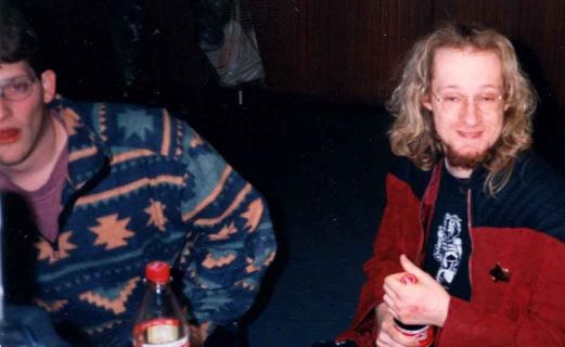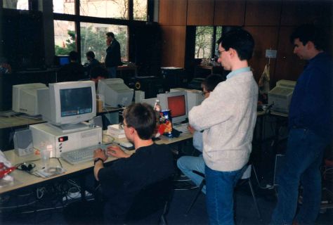 Hage of Wizcat is playing Doom (on a PC though) and Emmanuel and Steve of Wizcat are watching.