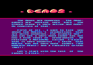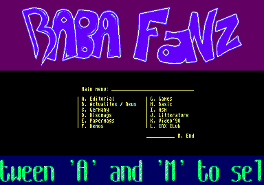 Je vais tester un fanzine sur disquette que tout le monde connait: Baba Fanz. Mais ce fanzine est déjà connu, alors pourquoi le tester ? Parce que tout simplement je possede l'exclusivitée: le dernier numéro est sorti il y a une semaine ! Et pour cause: j'ai programmé pas mal de choses pour ce fanzine... Mais avant tout, commencons par le début. Le numéro queje vais tester est donc le numéro 6, il est sur disc et tientsur une seule face de disquette. Plus de quatres mois ont été nécéssaires pour sa conception... Aprés un RUN"BABA-F6.", on arrive à une pré-intro (du style Epsilon) puis enfin à l'intro: en haut, on peut apercevoir un logo "Scorpion", au milieu, des logos "Baba Fanz 6" qui bougent verticalement, puis en bas un scrolling hardware (qui contient d'ailleurs une fonte transférée de PC). Déjà mauvais point: la rupture vibre... Enfin bon, on ne va pas chipoter pour cela. Ensuite, on arrive au menu principal. Là le résultat est simple mais clair: on a en haut un logo "Baba Fanz", au milieu le menu, puis en bas un scrolling horizontal (toujoursavec une fonte PC). Lorsque l'on a selectionné une rubrique, un petit logo"loading" s'affiche et le chargement s'effectue. Quelques secondes plus tard, on arrive à notre rubrique voulue: on adroit à un article créé avec le Ghoul's writer. Le design est simple mais esthétique. Et le contenu du fanzine ? C'est assez bien. Les actualités sont récentes, les initiations au Basic et à l'Assembleur sont intéressantes, les différents tests sont parcontre un peu lassant parce que toutes les productions testée sont déjà été testées dans un autre fanzine... Les articles "littérature" et l'article de Grees / NPS sont très intérressants. Ce qui est vraiment bien, c'est qu'à chaque article selectionné, on peut entendre une musique composée par Greg en personne ! Et pour la plupart des cas, ces musiques sont excellentes... Lorsque l'on selectionne la partie de fin, on peut voirun texte (toujours créé avec le Ghoul's writer) puis ensuite, aulieu de revenir au menu, on apercoit une petite demo programmée rien que pour le fanzine qui contient beaucoup de rasters etégalement un beau graphe créé par MAT juste pour l'occasion.Pour conclure, je dirais que ce fanzine n'est bien évidemment pas le meilleur de tous les fanzines que j'ai jamais vu, mais bon, le résultat est intéressant pour un fanzine créé rien qu'avec le Ghoul's writer. La note finale est... 14/20 ! Ghoul's Fanz