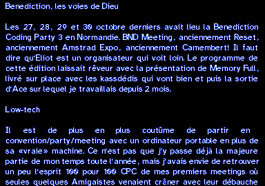 CPCrulez[Content Management System] v8.732-desktop/c Page créée en 751 millisecondes et consultée 881 foisL'Amstrad CPC est une machine 8 bits à base d'un Z80 à 4MHz. Le premier de la gamme fut le CPC 464 en 1984, équipé d'un lecteur de cassettes intégré il se plaçait en concurrent du Commodore C64 beaucoup plus compliqué à utiliser et plus cher. Ce fut un réel succès et sorti cette même années le CPC 664 équipé d'un lecteur de disquettes trois pouces intégré. Sa vie fut de courte durée puisqu'en 1985 il fut remplacé par le CPC 6128 qui était plus compact, plus soigné et surtout qui avait 128Ko de RAM au lieu de 64Ko. |