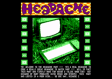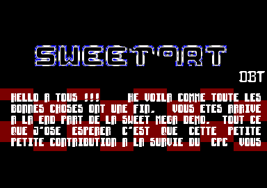 Headache. Là c'est une animation monstrueuse d'un CPC qui tourne qui vous attend au milieu de l'écran avec en haut un logo Headache avec un damier derrière (ne vous laissez pas abuser) et un writer en bas. La zic est signée Tom & Jerry. Impressionant, et très sympa... Mais après cela vient le temps du ... Bloody Code. Cette part est la plus technique de la démo. Ruptures lignes à lignes et autres se bousculent.. En haut se trouve un logo Sweet MD (mais où est passé Bouba ?) puis un effet de scrolls parallaxes avec un logo Bloody code qui se tortille au centre. Enfin si j'ai pas loupé quelquechose, puisque cette partie est la 3ème qui pose des problèmes de compatibilité CRTC. En dessous, un writer se ballade sur une courbe sinus, devant des rasters tramés. Et en bas se trouvent un writer, un gros logo DBT qui rebondit sur la gauche, et un tout petit scroll vertical avec les crédits de la démo. La zic, est encore signée JPMTrax, et les graphs eux sont d'horizons variés. Cette part est bien chargée et démontre bien que Nicky One maitrise de plus en plus les arcanes de l'assembleur. Les prochaines productions risquent donc d'être très surprenantes. Mais on arrive maintenant à la ... End part. Très simple et pourtant très jolie, au centre on trouve un writer sur un damier qui scrolle verticalement, et au dessus un affichage de logo en vague du plus bel effet. De quoi finir en beauté. Il faut aussi que je vous dise qu'entre chaque part, vous verrez un logo Loading (voir ci-contre) dessiné par Bébert du groupe Overlanders, qui sévissait auparavant sur Amiga, et qui nous démontre sa maitrise des formes et des couleurs en nous offrant un logo sublime. Bravo ! Et puis pour tout savoir, une cheat part se cache quelque part, à vous de chercher ! (Le coup de boule dans le clavier ne marche pas, j'ai testé pour vous). Pour conclure, je dirai que cette démo est très réussie, mais il faudra maintenant se pencher un peu plus sur le design, et à n'en pas douter, la prochaine sera encore meilleure.