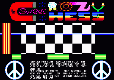 Crazy Chess. Cette part ne fonctionne également que sur CRTC 3, mais le seul bug noté sur CRTC 1 est juste un petit problème de registre 4 qui ne perturbe pas vraiment la part. Alors en haut, on a un logo mode 0 fait par Bouba , et puis en dessous le-dit Crazy Chess. C'est en effet un damier qui bouge, avec des rasters verticaux qui passent devant et derrière. C'est pas mal pensé comme effet, avec un petit raster bleu qui se ballade tout dans le fond. En dessous, des équalizeurs et un writer. La musique est encore une composition originale de JPMTrax, DJ de son état, et je peux vous dire que ça s'entend ! Le tout est bien entendu d'aimer ce style de zik. Une part très sympathique qui précède ...