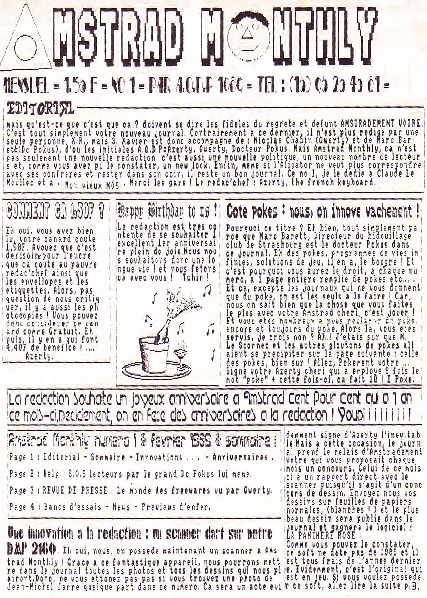 Non, non. Contrairement aux apparences, ii ne s'agit pas d'un nouveau fanzine mais d'un changement de titre et d'un remaniement de personne). Amstrad Monthiy est réalisé (sur AMX PAGEMAKER) par une équipe de 3 personnes : Xavier Renault (ex-Amstradement vôtre), Nicolas Chalin et Marc Barrott. Ce dernier, grand maître des POKES vous promet un grand nombre de vies infinies. En effet une page entière est consacrée à ces petites astuces qui facilitent la vie du joueur. Les maniacos du joystick p'hésiteront donc pas à dépenser sauvagement 50 F pour s'abonner à Amstrad Monthly. De plus, un concours est organisé et chaque mois il y a un logiciel d'Infogrames à gagner,