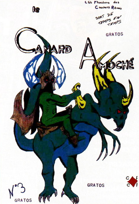 Le commencerai ma phrase par BRAVO. Le Canard amoché fait partie des fanzines qui paraissent de façon irrégulière et ça se comprend; vingt pages ultralisibles, centrées, brel la perfection. Et nous, la perfection; on aime ça. La présentation esi plutôt bien faite et le contenu aussi. Sinon, devinez ce qui vous attend à la page 19, des jeux, des tests de jeux poui être plus précis. A la page 17, un débat (ah ! ah !...] sur les fanzines. bizarre, non ? Je vous laisse le soir de le découvrir. Allons-y gaiement, je vais vous annoncei encore quelques sujets traités, les aventures du joy-stic-keur fou, un week-end à Vars, et là, j'en suis persuadé, extrême joie du public. Car on trouve à la page 5, les adresses du Journal officiel, des éditions Robert Laffont, du ministère de l'Agriculture et de la Forêt, du Conseil supérieur de l'audiovisuel ! D'ailleurs histoire de les aider, ils cherchent les adresses de Patrick Bruel, de Bruce Willis et des VRP, Allez, soyez sympa, aidez-les ! Une dernière petite chose, le texte en bas de la dernière page devrait figurer dans plus de fanzines. En somme, il est tout beau le petit, mais il lui manque un gros, que dis-je, un énorme détail... l'adresse.