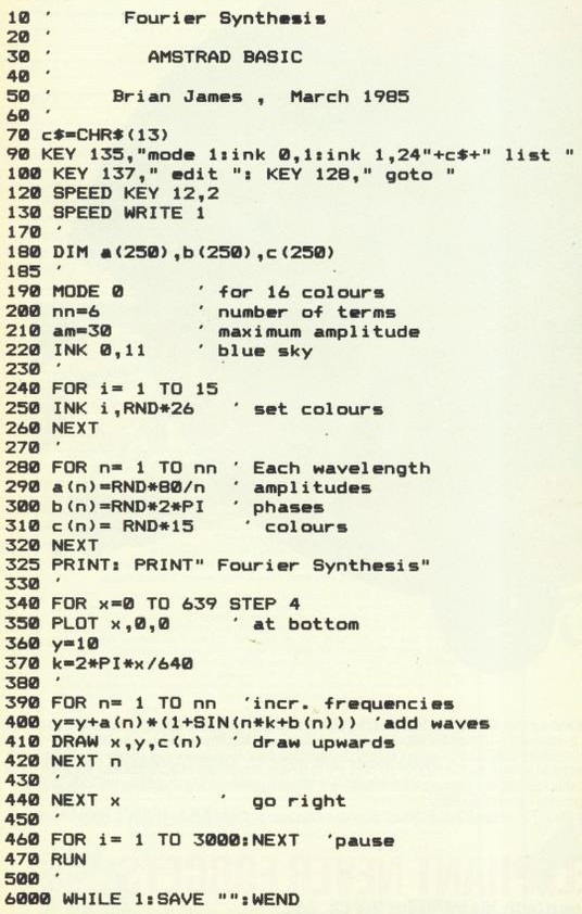 Fill in the background to that text-only adventure. Artist Brian James puts pixel to phosphor. The Landscape Creator is a program which creates detailed coloured landscape views, quickly and spontaneously. I developed this idea first on the Spectrum 48K, and now the program has been redesigned to fully exploit the beautiful graphics capability of the Amstrad CPC-464. It is a simulation of "creativity": the computer makes all decisions relating to a wide range of parameters concerning the hills, trees, flowers, lakes, islands, and buildings. The number of variable parameters is such that the resulting scene gives endless, unexpected surprises with a wide range of possible colour schemes. I developed this idea because, generally, very little "computer art" is actually generated by the computer. In nearly all cases the computer merely displays the picture, which is arranged by the programmer. We now have graphics packages which make it much easier for the operator to control the results on the screen. However, the result could just as well — or even better — be done with paint on canvas. It is a much more interesting challenge to get the machine to create its own pictures, based on a "knowledge" of the subject to be portrayed. This involves intricate mathematical modelling, and really begins to unleash the power and the intelligence of the microchip and do things in a way only the computer can. We have all seen some impressive colour graphics in computer games. In most cases these graphics make extensive use of user defined characters, which are rectangular elements — usually 8 by 8 pixels — used as building bricks. In contrast to this, the use of mathematical functions and probability theory allows us enormously improved flexibility, enabling the spontaneous creation of different scenes, giving endless surprises, even to the programmer! It is easy enough to write a program to rearrange a number of graphic shapes — say to select a building from a choice of five, choose a mountain from a choice of five, etc. etc. and put them together. But to simulate the idea of "creativity", we need to use a whole hierarchy of routines, building up the picture from the smallest elements, with freedom of choice at every stage in the process. User-defined characters are of limited use in this kind of exercise. My objective in the Landscape Creator was to have the minimum of fixed quantities: to allow the greatest freedom for variations, without deéparting from some basic properties of landscapes. This same idea I used in Country Cottages, a fun game for two players where you buy cottages and try your skill in managing the awful tenants. The cottages, the landscapes and the tenants are different every time you play the game. However, the Landscape Creator was designed from scratch, to produce greater variations, better colour schemes, better appearance of water and vegetation. The number of calculations involved is quite horrendous. Just doing a single pixel involves over 50 machine-code instructions. Though Amstrad Basic is very comprehensive and quite fast, the Landscape Creator has so many calculations to do that machine code was essential. Routines for plotting The Amstrad Firmware manual gives the addresses of inbuilt machine-code routines for plotting. These are easy to use and nicely crashproofed — but are therefore not as fast as would be desired. The Landscape Creator utilises its own extremely fast, compact plotting routines. Also the basic arithmetic routines were designed for the job. In the Landscape Creator, the object was to have the maximum variety of pictures. Whether it is creating a rugged skyline, an island, a patch of buttercups, or a castle, a flexible routine is used which combines probability functions with appropriate mathematics. The program needs some "knowledge" about the structure of landscapes, so that the different features will have reasonable shapes and fit sensibly together. Trees and buildings must not hang in mid-air; hills must not have enormous holes through them; land must not be drawn when it is below water! Foreground objects may hide more distant objects — not the reverse — and so on. Distant hills could have a grey or bluish colour; whereas the foreground can have much brighter colours. Lakes and sea can use a mixture of colours reflecting the hills and sky beyond. The precise formulation of the fundamental properties of a landscape is a subjective process — and this is where the art comes in — and the inspiration for this task came from the Highlands of Scotland and also Cumbria. The Amstrad version of the program displays several advances compared to the Spectrum version. A tremendous advantage of Amstrad graphics is that any pixel can be any colour. You can have 16 colours in Mode 0, with a resolution of 160 pixels horizontally by 200 vertically. For better resolution, Mode 1 gives you 320 horizontally, but only four colours. I chose Mode 0 with its much greater range of colours. If you want better resolution horizontally than vertically, then you could turn the monitor on its side, and swap your x and y axes. Pixels can be any colour Whatever mode you select, any pixel can be any of the available colours. This gives enormous freedom compared to most home computers. Foreground features can be drawn with no effect at all on the background colours. The colours actually used on the screen can be chosen from a selection of 27. Machine code is notoriously difficult to experiment with and so I am providing a simple program in Amstrad Basic for you to try out. It uses the RND function to generate a recipe for a mixture of sine waves with different wavelengths and phrases. The sum of all the different waves is a complex curve which can have enormous variability. It is a well-known method called Fourier Synthesis. Each waveform here is drawn with a different colour and — Hey Presto! — the Fourier Scries we learned in stuffy lecture theatres comes t