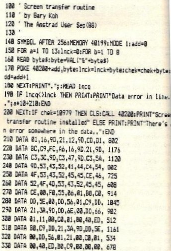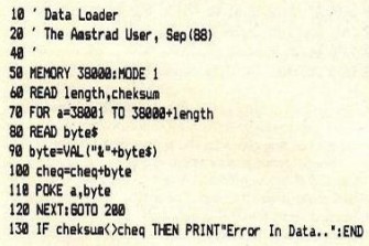 Gary Koh completes his series on graphics by explaining screen manipulation and windowing. This is the seventh and last part of our series on graphics. To round things off we will be having a quick look at screen manipulation and WIMP environments. Screen manipulation encompasses quite a large area. As such, the barrier between graphics and screen manipulation is quite foggy. Some things could belong to both categories at the same time. Screen manipulation involves manipulating the screen as opposed to drawing on the screen. One classic example is scrolling. This involves shifting the entire screen or a part of it in one direction. On the Amstrad this can be accomplished in one of two ways. The easiest and quickest way is to do a hardwire scroll. This simply changes the offset and scrolls the entire screen. If you want to scroll an area smaller than the screen then you are in a bit of bother. The only way to scroll a portion of the screen is to do a software scroll. If you try software scrolling on large areas of screen you end up with an annoying flicker. The reason for this is that to accomplish a software scroll you need to shift each byte manually in the area to be scrolled to a new area. A Z80 processor running at 4Mh may sound fast but trying to shift say 10000 odd bytes in less than a frame flyback is a bit beyond it. This is why it is most effective on areas of the screen that are about a quarter of it in size or less. On small areas of the screen you can scroll it in less than a frame flyback which makes the scrolling appear smoother. On larger areas the scrolling cannot be accomplished in a single frame flyback and so you can see it shift halfway during the scrolling making it jerky. The first listing this month is a machine code loader program. It must be merged with several of the programs this month. LISTING 1