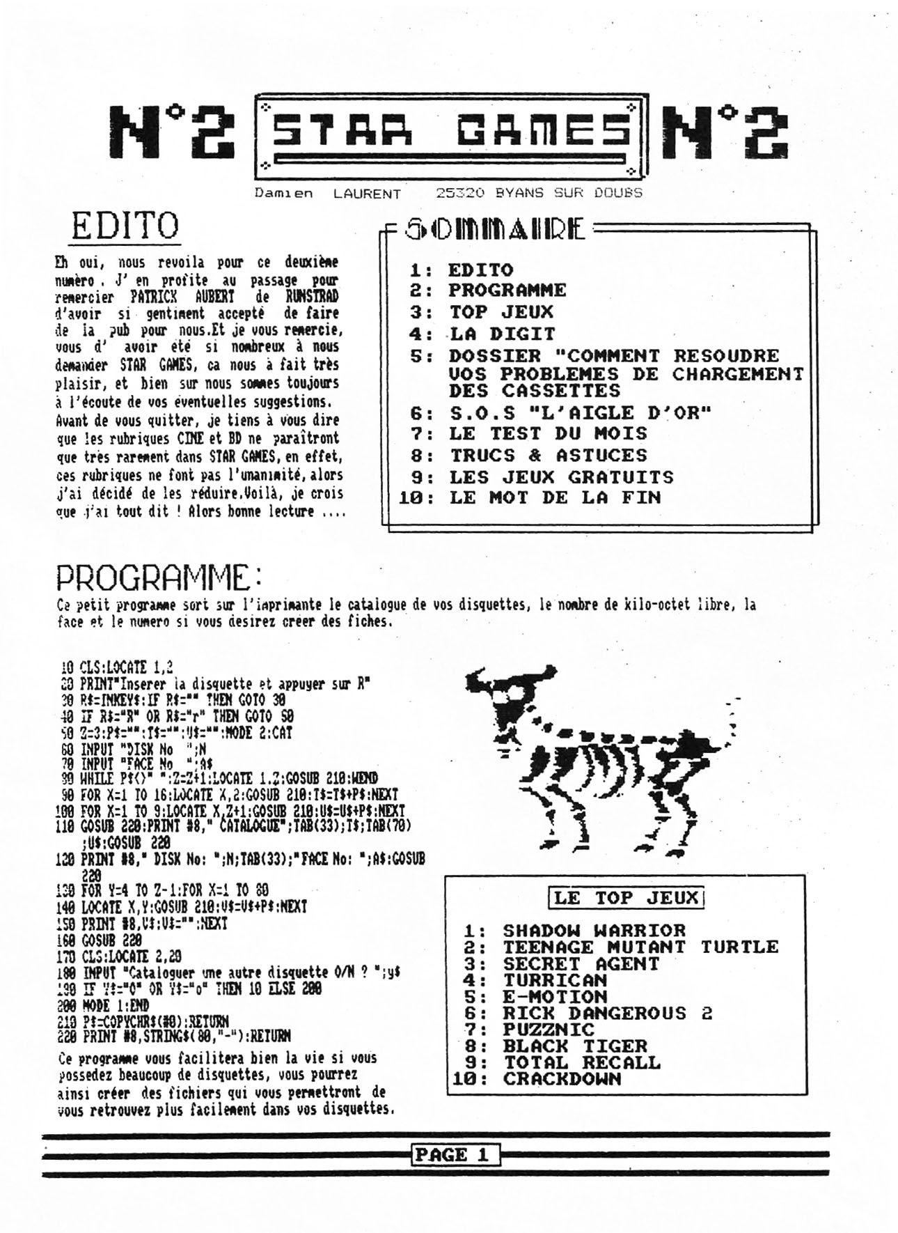 Star Games est un fanzine en 2 pages recto-verso comprenant les rubriques classiques : solution (l'Aigle d'or c'est pas trés récent tout de même), trucs et astuces, test de jeux etc.. Le programme et un dossier sur les problèmes de chargement des K7 complètent le tout. En revanche, il y a un gros problème concernant les jeux publiés dans la presse : il y a un Copyright sur les programmes publiés donc on ne peut les utiliser sans demander l'autorisation des Editions Soracom et de l'auteur. CPC Infos