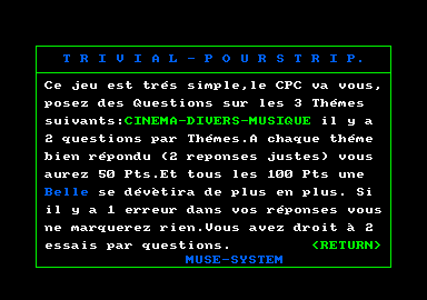 PAGES: 1 2 3 4 5 6 7 8 9 10 11 12 13 14 15 16 17 18 19 20 21 22 23 24 25 26 27 28 29 30 31 32 33 34 35 36 37 38 39 40 41 42 43 44 45 46 47 48 CPCrulez[Content Management System] v8.732-desktop Page créée en 314 millisecondes et consultée 791 foisL'Amstrad CPC est une machine 8 bits à base d'un Z80 à 4MHz. Le premier de la gamme fut le CPC 464 en 1984, équipé d'un lecteur de cassettes intégré il se plaçait en concurrent du Commodore C64 beaucoup plus compliqué à utiliser et plus cher. Ce fut un réel succès et sorti cette même années le CPC 664 équipé d'un lecteur de disquettes trois pouces intégré. Sa vie fut de courte durée puisqu'en 1985 il fut remplacé par le CPC 6128 qui était plus compact, plus soigné et surtout qui avait 128Ko de RAM au lieu de 64Ko. |