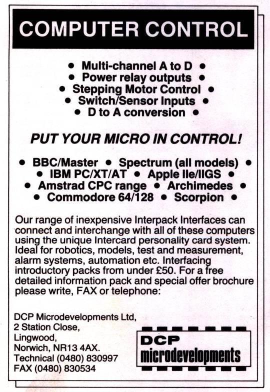 Put your computer to work with these versatile control and measurement interfaces from DCP Microdevelopments, described in the article on page **. Each Interpack offers a range of useful i/o functions and can be used with any of a number of common micros: just add the right intercard to match. For a more complex system you can link Interpacks together using the special DCP Bus Intercard. Order an Interpack together with an appropriate Intercard and you will also receive the matching connectors at no extra cost. Connector pack 1 includes two port plugs and a DCP Bus plug; connector pack 2 has ten 2mm plugs for other inputs and outputs.
