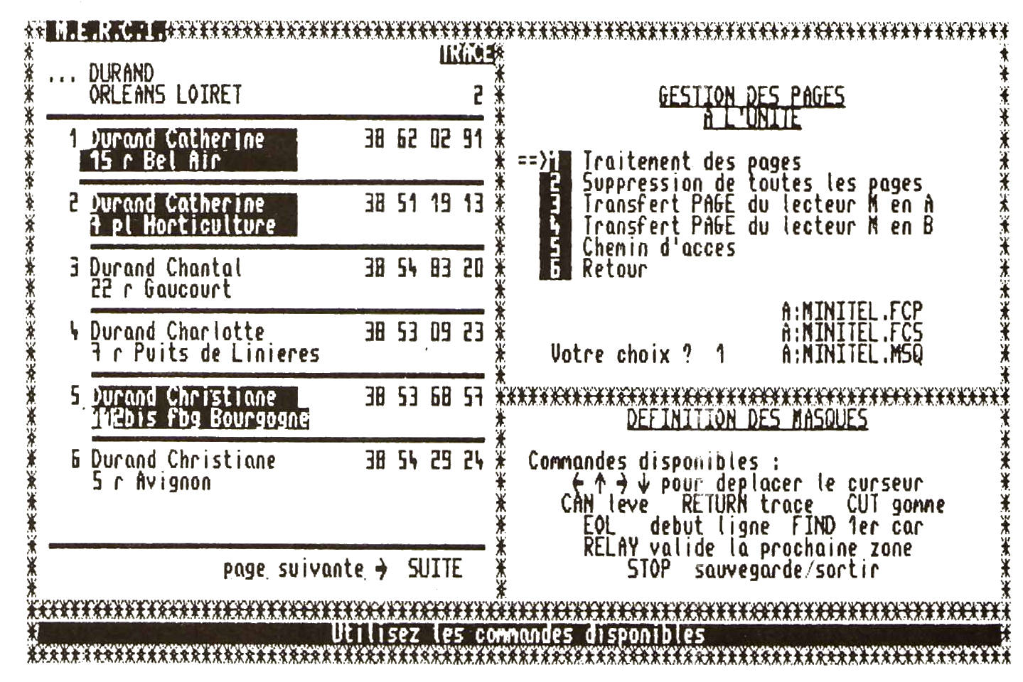 Gestion de pages à l'unité : Il s'agit d'un éditeur des pages que vous avez sauvegardées avec la fonction Minitel. Vous pouvez ainsi prélever des informations d'une page pour les ajouter à votre fichier séquentiel. Gestion par masques : Cette option permet de construire des masques définissant les zones d'écran qui vous intéressent, de les sauvegarder, et d'extraire les informations des pages. Gestion des extractions : Permet la création d'un fichier séquentiel où vous pourrez modifier à votre convenance les données extraites et même rajouter vos propres informations de manière à obtenir un fichier final personnalisé qui pourra ensuite être traité ipar d'autres logiciels tels que Wordstar, DBase 2, Basic, etc. Gestion annuaire : Peut-être la fonction la plus intéressante du Mercitel. Elle permet la gestion des pages de l'Annuaire Electronique, vous donne la possibilité de créer votre propre annuaire avec recherche sur le nom ou le numéro de téléphone, mais aussi de sortir des étiquettes adresses pour les mailings. La mise à jour peut s'effectuer par les pages Minitel ou à partir d'un fichier séquentiel. Enfin, la version PCW 2 permet, si l'on dispose d'un modem 300 bauds full duplex, l'accès au réseau Transpac professionnel ou l'échange de fichiers entre le PCW et un ordinateur tournant sous MS-DOS. Riche de ce large éventail de possibilités, Mercitel transforme le PCW en merveilleux outil de prospection commerciale. Marcel LE JEUNE , CPC n°15 |
