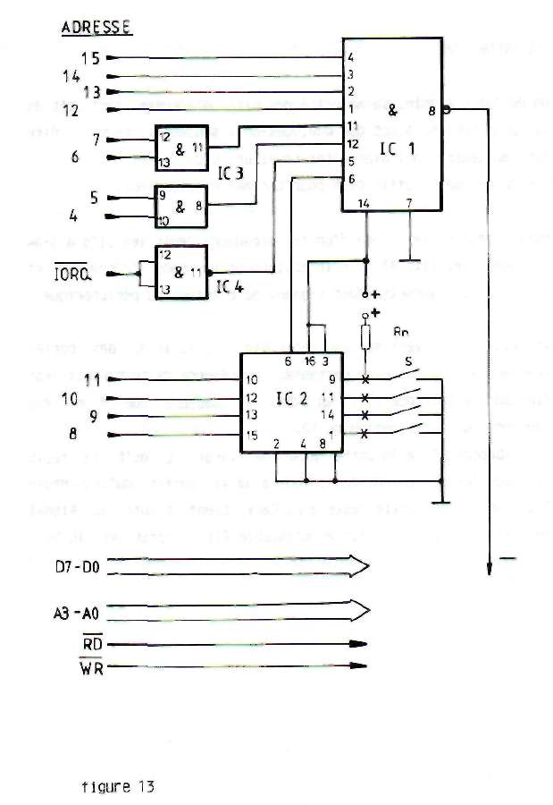 6.1 . DECODEUR SIMPLEDans un décodeur simple, la majorité des bits d'adresse sont câblés une fois pour toutes, alors que quelques-uns seulement peuvent être modifiés, en général à l'aide d'interrupteurs DIL. Ce genre de décodeur suffit déjà pour pas mal d'extensions. La figure 13 montre le schéma d'un tel décodeur. Seuls les bits A15-A4 sont utilisés, les bits A3-A0 n'interviennent pas dans l'adressage et peuvent servir à transmettre des signaux de commande au périphérique. Les bits A15-A12 arrivent sur une porte NAND, IC 1, IC 3, des portes AND, transmet à IC 1 les bits restants. La présence de ce circuit est justifiée par le fait que IC 1, un 7430, ne possède que 8 entrées alors que nous en avons besoin de 10. La sortie (broche 8) de la porte NAND ne vaudra L qu'à la seule condition que TOUTES les entrées soient à H. Il suffit qu'une seule soit à L pour que la sortie reste à L. Ceci tient compte du signal IORQ qui, étant actif à L, doit au préalable être inversé avec IC 4.