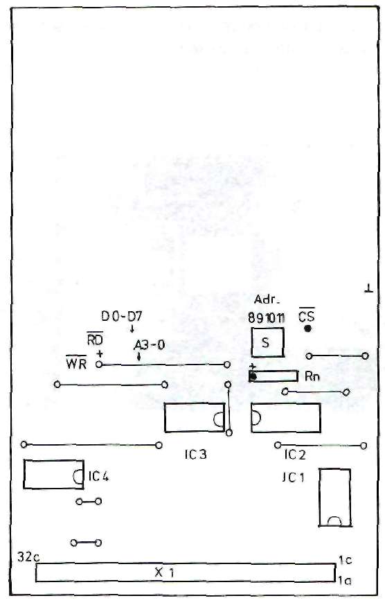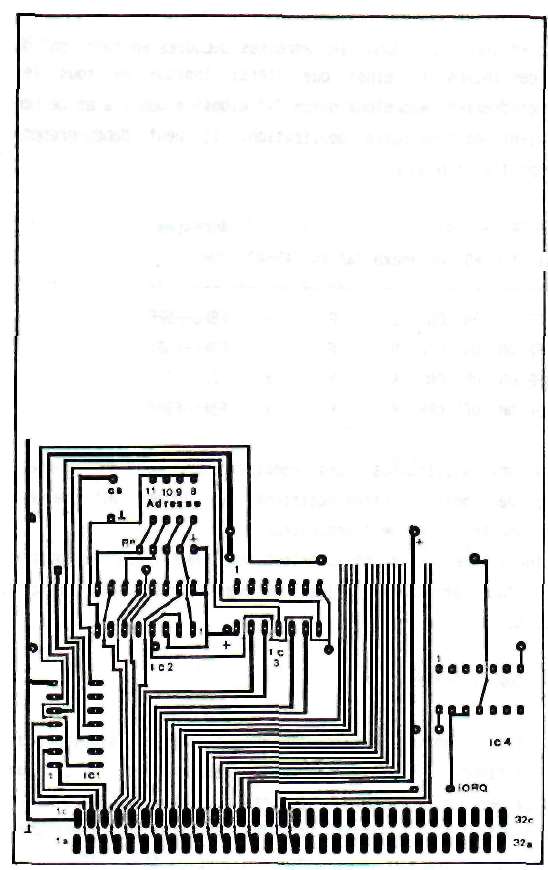Les bits d'adresses A11-A8 attaquent l'entrée du comparateur IC 2. Ce circuit est en mesure de comparer un mot de 4 bits présent sur ces entrées avec les 4 bits préréglés à l'aide des inters DIL, Si les deux nombres binaires sont égaux alors il présente un état H sur sa sortie, qui vient s'ajouter aux autres entrées de IC 1. Le réseau de résistances Rn sert à maintenir un état H lorsque les interrupteurs sont ouverts. Quand on ferme l'interv la broche est forcée à L. D'une manière générale, il faut retenir ceci à propos des Interrupteurs à résistance de polarisation: I--------------------------------------------I I Etat logique des entrées ô inters DIL: I I--------------------------------------------I I Un interrupteur ouvert produit un état H I I--------------------------------------------I I Un interrupteur fermé produit un état L I I--------------------------------------------ISi toutes les conditions de l'adressage sont remplies, la sortie de IC 1 fournit le signal chip-select qui autorisera le circuit périphérique à entrer en action.ADRESSAGE Voici maintenant comment fonctionne la programmation de notre décodeur d'adresses: Le tableau ci-dessous vous donne les adresses décodées en fonction de la position des inters DIL, ainsi que l'état logique de tous les autres bits d'adresses. Rappelons qu'un "x" signifie que l'état de ce bit n'intervient pas dans cette application, il peut donc prendre indifféremment l'état H ou L. INTERS --- DIL ; Adresses A15-A12 A11 Al0 A9 A8 =hexa A7-A4 A3-A0 de - à --------------------------------------------------------------------- F OFF ON ON ON 8 F x F8F0 - F9FF F OFF ON ON OFF 9 F x F9F0 - F9FF F OFF ON OFF ON A F x FAFO - FAFF F OFF ON OFF OFF B F x FBFO - FBFF Ces adresses sont utilisables sans complications par un appareil périphérique, par contre d'autres positions des inters DIL peuvent entraver le fonctionnement de l'ordinateur. Veillez toujours à ce que le périphérique obtienne bien sa propre adresse, il faut absolument éviter qu'une adresse soit occupée plusieurs fois. INDICATIONS POUR LA REALISATION Le tracé du circuit imprimé pour ce décodeur d'aaresses simple vous est donné à la figure 14. Il a été conçu de telle manière à ce que vous disposiez de tous les signaux importants, RD, WD, D7-D0, la tension d'alimentation et la masse, pour une utilisation ultérieure. Le schéma d'implantation des composants se trouve en figure 15.  FIGURE 14: TRACE DU CIRCUIT IMPRIME POUR LE DECODEUR D'ADRESSES SIMPLE. CE CIRCUIT PEUT SERVIR A LA MISE AU POINT DES EXTENSIONS.