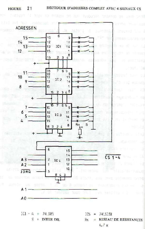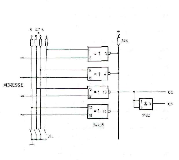 Jusqu'à présent la programmation des adresses a été réalisée à l'aide de circuits intégrés du type 7485. Mais il est également possible d'obtenir le même résultat avec des portes EXNOR, par exemple du type 74266 ou 74836, comme cela est montré à la figure 22. Le seul inconvénient est que les portes EXNOR sont plus difficiles à trouver dans le commerce. Comme nous l'avons vu au chapitre 5, la sortie d'une porte EXNOR ne vaut H que si les deux entrées sont dans le même état. Il est ainsi possible de comparer chacun des bits avec son interrupteur associé. Un inverseur supplémentaire en sortie permet de disposer d'une sortie active à L. Le schéma figure 22 ne montre que les 4 premiers bits, il est bien évident que le décodage peut être étendu à autant de portes qu'on le désire. Il n'est bien sûr pas possible de présenter un décodage d'adresse parfaitement adapté à chaque application. C'est à vous de voir Jusqu'à quel point vous voulez équiper votre ordinateur avec des extensions. Mieux vaut prévoir à l'avance une petite dépense supplémentaire qui permet d'assouplir le fonctionnement du décodeur. Les montages décrits dans ce livre vous sont présentés d'une part avec le décodeur d'adresses simple, où l'on peut tout de même programmer 4 bits, et d'autre part avec le décodeur universel.