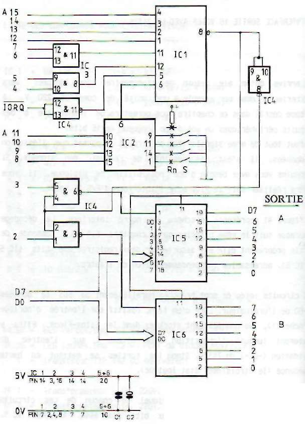 11. INTERFACE SORTIE 16 VOIES AVEC LE 74374Il arrive qu'on aie besoin de transmettre des données vers l'extérieur, comme par exemple à une unité de commande 220 V. Le partage décrit dans ce chapitre vous permettra de transmettre à des circuits périphériques un mot d'une longueur de 16 bits. Il faut tout de même signaler que ce circuit ne permet que l'émission de données, il n'est pas possible de recevoir des signaux. Si néanmoins vous avez besoin d'une possibilité de dialogue, il vous faudra réaliser soit le PIO, soit l'interface d'E/S 16 voies. La figure 41 représente le schéma de notre interface. Le décodage d'adresse suit le même principe qu'au chapitre 6.1. La commande de sortie proprement dite est assurée par deux registres D 8 bits (IC 5 et IC 6), adressables indépendamment l'un de l'autre. Ces circuits intégrés sont branchés parallèlement au BUS de données D7-D0 de l'ordinateur. Lors d'un flanc positif sur l'entrée d'horloge (broche 11), les données sont stockées dans les Flips-Flops. Elles y resteront jusqu'à l'apparition d'un niveau L sur l'entrée de - validation (-0E-) du 74374. Sinon les sorties se mettent en haute impédance (le "troisième" état logique). Pour permettre un adressage individuel de chacun de ces circuits intégrés, nous avons besoin de deux bits d'adresse, A3 pour IC 5, sortie A, et A2 pour IC 6, sortie B.  FIGURE 41 : INTERFACE SORTIE 16 VOIES
