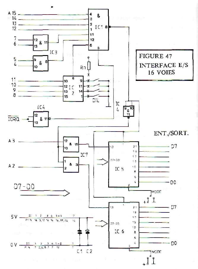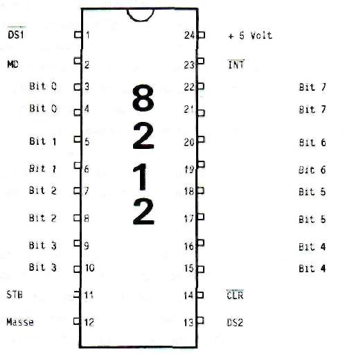 12. INTERFACE ENTREE/SORTIE 16 VOIES AVEC LE 8212L'interface du chapitre dernier n'autorisait que des opérations de sortie. Le circuit décrit ici est capable de transmettre des données vers l'extérieur, mais aussi d'en recevoir pour pouvoir les traiter par la suite. Son mode de fonctionnement -uniquement en entrée, uniquement en sortie ou les deux combinés- n'est pas fixé par programme, contrairement au PIO que nous verrons plus loin, mais par une intervention physique. Cela simplifie grandement la programmation. Ce sont deux circuits intégrés du type 8212 qui constituent les pièces maîtresses de cette interface. Leur brochage vous est donné à la figure 46. Ce circuit intégré est construit â base d'une mémoire réalisée à l'aide de bascules (flip-flop), et d'un driver pour chaque sortie. Le CI est ainsi capable de fournir un courant de 15 mA sur chacune des sorties D7-D0. Au contraire du 8255, commandé par programme, les fonctions du 8212 sont déterminée une fois pour toutes avec des connexions électriques. SORTIES DONNEE SORTES DONNEE FIGURE 46 : BROCHAGE DU CIRCUIT INTERFACE 8212 Les signaux de commande suivants se tiennent à la disposition de l'utilisateur; INT: Interruption, actif à L, broche 23 Sous certaines conditions on peut déclencher ici une interruption de programme. Pour nos applications ce signal ne sera pas utilisé. MODE: Détermine le mode de fonctionnement, broche 2 Le 8212 connaît trois modes différents: – mode émission de données = niveau H – mode réception de données = niveau L – réception de données avec interruptions STROBE: Validation de la réception de données, broche 11 CLEAR: Reset, actif à L, broche 14 CS1: Chip-Select, actif â L, broche 1 CS2: Chip-Select, actif à H, broche 13 Le 8212 dispose de deux entrées Chip-Select et peut donc être activé soit par un niveau H, soit par un niveau L. Si la condition Chip-Select n'est pas vérifiée, les sorties se mettent en haute impédance, le troisième état logique. Le schéma complet de l'interface E/S se trouve à la figure 47, Le décodage d'adresse emploie la technique du chapitre 6.1. On nécessite deux bits d'adresse, A3,et A2, pour pouvoir sélectionner séparément les deux circuits d'E/S.