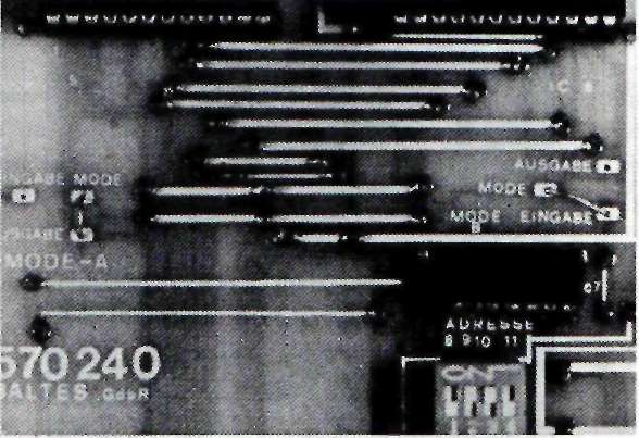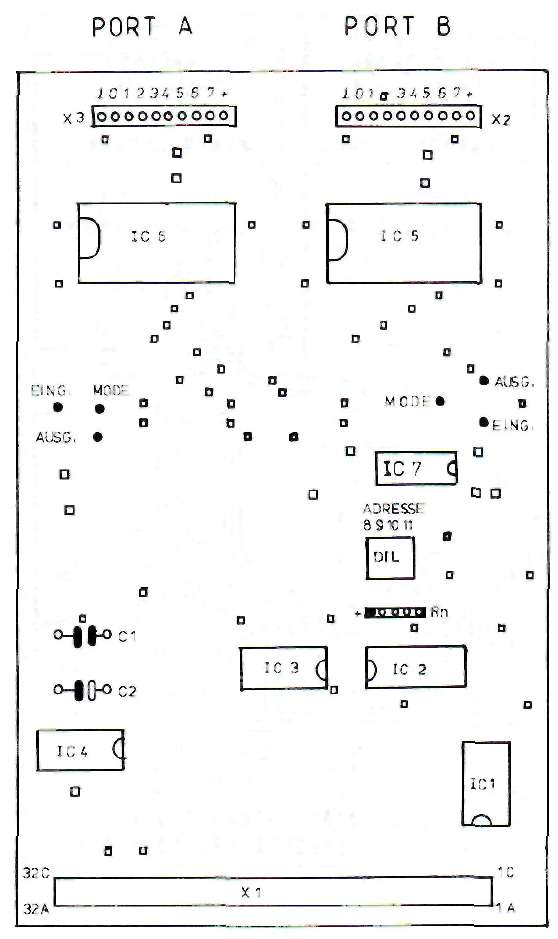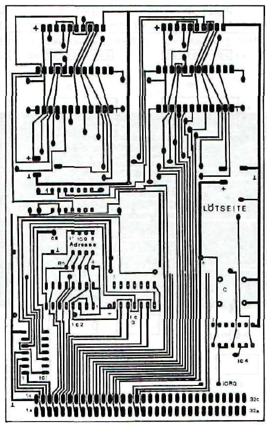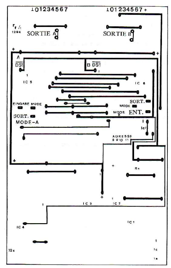 Pour vérifier la condition Chip-Select, actif à L, on a relié les deux entrées à la broche 8 de IC 1. On aurait aussi pu les mettre à la masse. L'entrée 13 du 8212 est active à H. Si on la reliait directement au bit A3 (resp. A2), le circuit serait validé à chaque fois que ce bit est positionné. Dans ce cas tout le travail de décodage serait anéanti, quand on pense au nombre d'adresses pour lesquelles A3 ou A2 sont au niveau H. Or notre but est Justement de maintenir ce domaine d'adresses le plus étroit possible. Pour cette raison l'entrée de validation de IC 5/6 reçoit son signal après une combinaison logique des deux bits A3 et A2 avec la sortie de La condition est la suivante: IC 5 ou IC 6 ne doivent être validés que si le bit correspondant A3 ou A2 est au niveau H et qu'en même temps la sortie Chip-Select de IC 1 (broche 8) présente un niveau L. Si vous avez consciencieusement étudié le chapitre 5, où l'on traitait des différentes portes logiques, vous avez certainement déjà trouvé une façon de résoudre ce problème. Pour une meilleure compréhension, résumons ce que nous venons de voir dans une table de vérité: -ENTREES- –SORTIE– A3 -CS- broche13,IC5 ----------------------------------- L ;L ; L L ;H ; L H ;L ; H H ;H ; LEncore une fois vous chercherez en vain un circuit réalisant une telle fonction, même avec des ou-exclusif on ne peut rien faire. Par contre si nous inversons un des deux signaux d'entrée, par exemple le Chip-Select comme cela a été fait à la figure 47, nous obtenons quelque chose de plus courant. Voici la nouvelle table de vérité:–ENTREES– –SORTIE– A3 +CS+ broche13,IC5 ------------------------------------ L ;L ; L L ;H ; L H ;L ; L H ;H ; HEt nous reconnaissons immédiatement la fonction AND, qui se trouve par exemple dans un bottier 7408 (1C 7). Les bits Al et AO .n'interviennent pas dans le décoaage de cette interface. Rappelons que l'on désigne l'état d'un bits qui n'influence pas le résultat par un "x", ce qui signifie qu'il prendre indifféremment l'état H ou L. La broche 2, MODE, permet de sélectionner le sens de transit des données. Un niveau H fait travailler le CI en émission, un L le fait travailler en réception.Le circuit intégré est compatible TTL, le signal doit satisfaire à certaines conditions: en émission: ------------ état H – au moins 2,4 Volt état L – au plus 2,0 Volt en réception: ------------- état H – au moins 2,0 Volt état L – au plus 0,8 Volt ADRESSAGE: Décodeur d'adresses: programmable sur F8F , F9F , FAF , FBF Les 4 bits de poids faible de ces adresses on la signification suivante: A3 A2 A1 A0 adr. hexa. MODE signification ----------------------------------------------- 0 1 x x "4" - "7" "H" IC5 en sortie 0 1 x x "W" - "7" "L" IC5 en entrée 1 0 x x "8" - "B" "H" IC6 en sortie 1 0 x x "8" - "B" "L" IC6 en entrée 1 1 x x "C" - "F" "x" état interdit !Les valeurs C, D, E et F pour le nibble (demi-octet) de poids faible ne sont pas permises car il pourrait se produire des complications sur le BUS de données si l'on activait ensemble les deux circuits ! Bien entendu vous n'avez pas à retenir toutes ces adresses, deux suffisent, mais il faut quand même faire attention è ce qu'elles ne soient pas déjà affectées à une autre extension. Voici une suggestion:IC 5 activé: port A – adresse FBF4 IC 6 activé: port B -- adresse FBF8 Les inters DIL affectés aux bits A11-A8 doivent donc être positionnés sur "B": A11 A10 A9 A8 ----------------- OFF ON OFF OFF = 1 0 1 1 = BREALISATION DU CIRCUIT A cause des nombreuses interconnexions il a encore une fois été nécessaire d'employer un circuit imprimé double face, dont vous pouvez voir le tracé aux figures 48 et 49. Le schéma d'implantation se trouve en figure 50. Les endroits où il faut établir une liaison entre les pistes des deux côtés sont marqués d'un petit carré. LISTE DES COMPOSANTS IC 1 = 74LS30 IC 2 = 74LS85 IC 3 = 74LS08 IC 4 = 74LS00 IC 5 = 8212 IC 6 = 8212 IC 7 = 74LS08 Rn = Réseau de résistances 4 x 4,7k DIL = Quadruple inter DIL C1 = 100 nF C2 = 10-47 uF/10 Volt X1 = Connecteur VG 2 x 32 broches, a+c X2,3 = Connecteurs à 10 picots au pas de 2,54 mm On commence par établir les nombreux points de contact entre les deux faces du circuit imprimé (pour la méthode voir chapitre 3). On continue avec les supports de CI et le connecteur, puis les autres composants. Pour terminer il vous faut installer deux straps (ponts de fil) en fonction du mode dans lequel vous désirez faire fonctionner la carte. Le connecteur VG est installé de telle manière à ce que vous puissiez enficher le circuit sur la carte d'extension et sur la carte d'adaptation. Chaque port dispose, en plus du BUS de données, de la masse et du +5 Volt.  FIGURE 48 : CIRCUIT IMPRIME DE L'INTERFACE E/S 16 VOIES COTE COMPOSANTS
