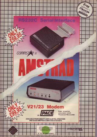 Communiquer avec son micro-ordinateur les modems, les périphériques Nous entrons dans une époque où la communication, qu'elle soit en entreprise, dans la rue ou chez vous, va prendre une place de plus en plus prépondérante. La communication a de nombreux aspects, dans le cadre qui nous intéresse, c'est-à-dire l'informatique et plus particulièrement l'AMSTRAD, elle permet de connecter des ordinateurs entre eux pour améliorer le partage des ressources informatiques dans une entreprise (imprimante etc), de faire communiquer un ou plusieurs ordinateurs par l'intermédiaire du réseau téléphonique, de collecter des données dans des banques du même nom, d'utiliser plus efficacement un Minitel afin (puisque le prix de la connexion se mesure en temps et qu'elle coûte cher) de diminuer le prix des consultations et bien d'autres choses encore. La communication entre ordinateurs, il faut le répéter, n'a pour limites que celles de l'imagination des créateurs. On voit fleurir actuellement une multitude de microserveurs, mais ils se ressemblent tous (pour la plupart). Il est rare qu'une idée vraiment nouvelle vienne bouleverser le jeu. On a vu, il y a quelques années, apparaître des messageries interactives sur Minitel, ce qui, en soi, était un début d'ouverture de la télématique vers le grand public, provocant ensuite l'explosion que l'on sait. Actuellement, en Angleterre, des jeux interactifs voient le jour sur PRESTEL; avec un microordinateur, le joueur se connecte sur l'équivalent anglais du Minitel, et peut, en compagnie de dizaines d'autres joueurs, et en temps réel, affronter des monstres dans Donjon & Dragon, piloter un vaisseau spatial et conquérir des galaxies. La télématique n'est pas le seul terrain sur lequel l'imagination la plus fertile peut être appliquée. Aux Etats-Unis, on commence à voir apparaître des jeux permettant, pour peu que l'on dispose un modem à l'arrière de l'appareil, de jouer à deux joueurs, et à distance. C'est le cas d'AMERICAN CHALLENGE de MIND SCAPE pour Apple II et PC, par exemple, qui représente une régate maritime. Si vous trouvez dans les petites annonces un possesseur d'ordinateur personnel Apple ou PC, et qui détient aussi ce logiciel, vous pouvez, par l'intermédiaire du téléphone, et ce, même s'il habite à l'autre bout de la planète ("Bonjour les factures"), vivre en trois dimensions en direct et en temps réel, la plus grande course nautique de ce siècle. L'ordinateur du joueur connecté transmettra au vôtre les coordonnées de son navire, et vous pourrez voir ce dernier se déplacer au gré des man£uvres de l'adversaire, sur votre écran. Toutes les tactiques sont alors envisageables. A quand les « POLE POSITION », « FLIGHT SIMULATOR », et autres jeux à deux. branchés ? Nul doute que ce type de jeu a de grandes chances de se généraliser dans les années à venir. Et pourtant, sur Amstrad, rien de tout cela. Nous n'avons tout de même pas à nous plaindre. Maintenant, grâce à d'excellents produits, et d'autres moins bons, la gamme Amstrad communique, et elle le fait plutôt bien. Nous avons essayé de recenser la plupart des matériels disponibles sur les CPC 464/664/6128 et PCW 8256/8512 et, comme vous allez le voir, la gamme est relativement étoffée : modem, interfaces minitel, réseaux, serveurs, cordons minitel/Amstrad. Un point d'interrogation subsiste : à ce jour aucun micro-serveur fonctionnant pour ou sur Amstrad ne s'est fait connaître. Si vous, qui me lisez, êtes l'un de ceux-ci, écrivez-moi à la rédaction, nous nous ferons un plaisir de parler de vous. Abordons maintenant le descriptif des matériels disponibles. Les interfaces RS232 Elles ne sont pas très nombreuses sur le marché, et incontestablement, celle qui fait le plus de recette est l'interface pour CPC d'AMSTRAD qui, pour un prix faible (590 F), est livrée avec un logiciel de communication de bonne qualité lequel, malheureusement, n'inclut pas les fonctions Minitel (mais un constructeur français a trouvé une solution). Avant de vous présenter les interfaces existantes, peut-être est-il important, pour certains, de rappeler ce qu'est une interface dite « série ou RS 232 ». Cette interface représente, en fait, la norme de communication par excellence. Chacun des ordinateurs actuellement disponibles dans le commerce en est équipé (sauf cas exceptionnels comme par exemple le BBC d'Acorn qui détenait, lui, une RS423). Ceci permet une certaine universalité des fichiers de textes qui peuvent, sans trop de problèmes, passer d'un ordinateur à un autre. Les interfaces séries sont généralement paramétrables en plusieurs vitesses, celles-ci étant exprimées en bauds (bits par seconde). La vitesse maximum possible avec une RS 232 est de 19 200 bauds, la plus faible étant de l'ordre de 50 ou 75. En règle générale, tous les périphériques de types : réseaux, modems, sont connectés sur l'interface série. AMSTRAD L'interface série construite par AMSTRAD est sans nul doute la plus complète du marché. Elle intègre, à la fois, le port RS 232 et l'un des logiciels d'exploitation les plus complets qui ont été écrits pour des interfaces de ce type. Elle est paramétrable à 50, 75, 110, 150, 200, 300, 600, 1200, 1800, 2000, 2400, 3600, 4800, 9600 et 19200 bauds... Ouf ! Difficile de faire mieux, elles y sont toutes. Un système d'exploitation très complet est livré avec, et permet tant sous BASIC (avec des instructions rajoutées de type RSX) que sous CPM 2.2 (pour les CPC464/664) et CP/M 3.0 (du 6128) de la programmer le plus simplement possible. De nombreuses instructions Basic offrent la possibilité de contrôler, sous le langage de base de l'Amstrad, les plus infimes caractéristiques de celles-ci, grâce à plus de trente instructions. Deux logiciels émulateurs sont inclus, le premier, obtenu grâce à la commande : |TERMINAL, est un émulateur VT52, et le second obtenu avec la commande : |PRESTEL