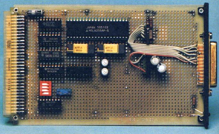 Stellen Sie sich einmal vor, Sie bewegen eine Kugef in alle Richtungen und woilen die Bewegungen mit dem Computer erfassen. Dann müssen Sie an der x- und der y-Achse die Bewegungen in analoge elektrische Signale umsetzen. In unserem Faile nehmen Sie ein Zehn-Gang-Potentiometer, das als Spannungsteiler geschaltet ist. So erhalten Sie ein analoges Signal, 'das Sie dann an die Eingänge der A-D-Wandler legen. Der A-D-Wandler wiederum setzt die Spannung, die zwischen minus 5 und plus 5 Volt liegt, am Ausgang in einen numerischen Wert zwischen 0 und 1023 um. Daraus resultiert eine Auflösung von jeweils 1024 Werten in derx- und der y-Achse. Da die abgebildete Wandler-Karte ein Muster ist, weicht sie ein wenig von der endgültigen Version ab (ein IC und zwei kleine Abgleichpotis entfallen).