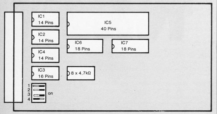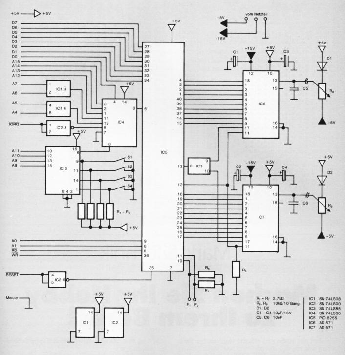 bestimmt »SYMBOL 265«. Über die Variablen XPOS und YPOS läßt sich die momentane Position des Trackball-Cursors ermitteln. Den Wert aus den A-D-Wandlern stellen Sie mit: PRINT PEEK(&B013) +256*PEEK (&B014)für den ersten A-D-Wandler und mitPRINT PEEK(&B015)+256*PEEK (&B016)für den zweiten fest.Die erste Feuertaste läßt sich über »PEEK(&b010)« und die zweite über »PEEK(&b011)« abfragen. Wichtig ist außerdem noch die Zeile »PRINT CHR$(23) + CHR$(1}«. Sie gehört an den Anfang jedes Programms. Nach Abtippen des Ustings empfiehlt es sich, es sofort auf Kassette oder Diskette zu sichern. Man kann nun eigene Programme anfügen - beispielsweise Grafik-Programme - die mit dem Trackball Zusammenarbeiten. Kommen wir zur Praxis - dem Hardwareteil - zu unserer A-D-Wandler-Karte (Bild 1). Wir brauchen einen Lötkolben, Lötzinn, Kupfer-Lackdraht (0,2 mm Durchmesser), eine Lochraster-Leiterplatte, einige Widerstände, zwei A-D-Wandler des Typs AD 571, einePIO 8255 und ein bißchen »digitalen Kleinkram«. Die Leiterplatte wird nach Bild 3 verdrahtet. Doch bevor Sie sich nun an das Zusammenbauen der Platine heranmachen, noch einige wichtige Tips: