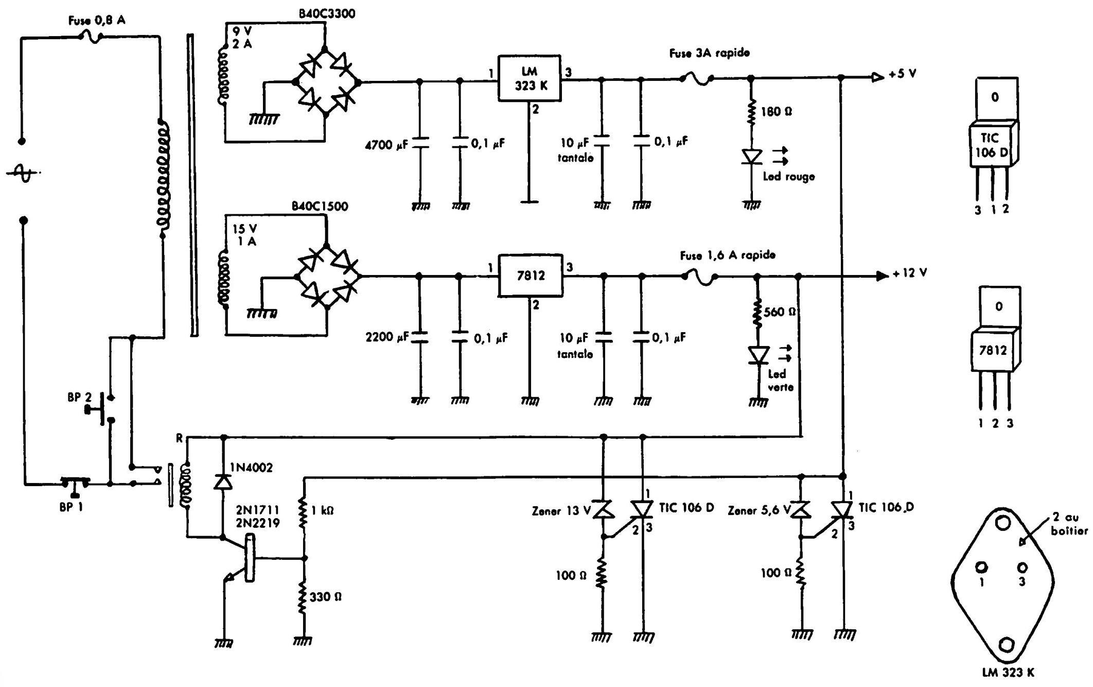 Vous avez un moniteur monochrome, mais vous aimeriez bien avoir la couleur de temps en temps. Seule solution simple et pas chère : la prise PERITEL, bien sûr ! Oui, mais... cela vous oblige à laisser le moniteur AMSTRAD branché puisqu'il contient l'alimentation de votre micro !Deux écrans dont un à proximité du clavier, ce n'est pas l'idéal I Alors, pourquoi ne pas réaliser l'alimentation décrite, simple, sûre et bien protégée en cas d'incident ? Une pression sur BP 2 met le montage sous tension qui est maintenue grâce au contact travail du relais qui a collé. Pour couper, une petite pression sur BP 1. En cas de disparition du 12 volts, du 5 volts (ou des deux I), le transistor se trouvant bloqué, le relais décolle et coupe l'alimentation. A l'opposé, si l'une des tensions devient supérieure à la valeur fixée, le thyristor correspondant met en court-circuit l'alimentation, ce qui fait fondre le fusible (rapide, c'est indispensable I) et met l'alimentation hors tension, le relais n'étant plus alimenté. Cette alimentation est prévue à l'origine pour le CPC 664, mais rien n'empêche de l'utiliser avec le 464. On pourra, dans ce cas, se passer du 12 volts, le relais sera alors relié au + 5 volts (il faudra, dans ce cas, utiliser un relais 6 volts ; ça colle à 5 volts dans la grande majorité des cas). Il vous faudra quand même du 12 volts pour la prise PERITEL ! Bonne bidouille ! NDLR : Il n'a pas été prévu de mylar, le transfo étant monté sur le circuit imprimé, le tracé sera fait en fonction du modèle de transfo disponible. On pourra éventuellement réaliser le tout sur une plaquette de "VEROBOARD". - TR Transfo 220 volts/9 volts 2 A et 15 volts 1 A (à défaut 1 transfo 220/9 et 1 transfo 220/15).