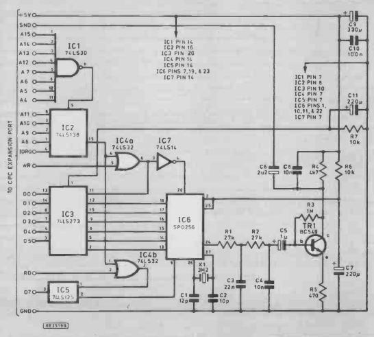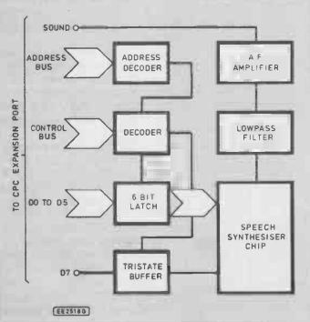 Low-cost voicing for your Amstrad. Based on the popular SP025G "speech" chip. Although they rank as one of the most popular computer ranges, the number of published add-on projects for the Amstrad CPCs seems to be relatively small. Possibly this is due to the fact that Amstrad launched these computers after the main home computer boom, when interest in computer projects had waned somewhat. Anyway, this article describes an add-on speech synthesiser for any computer in the CPC range, and helps to rectify the lack of projects for these machines. The unit fits onto the CPC expansion port, and provides its speech output via the computer's built-in loudspeaker. The circuit is based on the popular SP0256 speech synthesiser chip This is a relatively cheap speech chip, but is one which gives an unlimited vocabulary. Fig. 1. The Amstrad CPC Speech Synthesiser block diagram. >> Unlike some methods of speech synthesis, the one used by the SP0256 does not require large amounts of the computer's memory in order to store a few words. In fact a dozen long sentences would probably require no more than about IK of memory. The speech quality is not as good as some systems, but is quite acceptable. Considering uie simplicity of the system used in this method of speech synthesis, the speech quality is remarkably good. ALLOPHONES There is a slight drawback in using the SP0256 speech chip, and this is simply that it is relatively difficult to program well. It produces words by stringing together a number of “allophones”, w ch are the basic sounds of speech. For example, “shhhh”, “arrr”, and “ow” are the sort of simple sounds that can be fitted together to make up the more complex sounds of complete words. These words, separated by pauses where necessary, can then be put together to make complete sentences, or even a number of sentences if required. For this system to be successful you must have at your disposal all the sounds needed to make up all the words in the language. Apparently the sounds required vary significantly fiom one language to another, ind the sounds for a particular language are called “phonemes”. The SP0256 contains sixty four phonemes (including pauses) that permit any English word to be produced. For this system to work well the allophones need to be chosen very carefully, and the obvious ones are not necessarily the ones that give the best results. How-ever, with a little experience it is possible to put together some intelligible sentences in a reasonably short space of time, perhaps with a little “fine tuning” being needed in order to get things just right. SYSTEM OPERATION The block diagram of Fig.l shows the basic arrangement used in this speech synthesiser. The speech synthesiser chip is at the heart of the unit, and th.s includes a 2K by 8 ROM that contains all the allophones. It has provision for operation with up to three external ROMs, giving a maximum capacity of 256 allophones. However, in most circuits (including this one) no external ROMs are used. There are 64 allophones available to the user, and these are selected via six address inputs. Rather than a true audio output, the SP0256 provides a pulse width modulated output signal. In other words, the output signal is a high frequency pulse signal, with the pulse width being varied to give the required audio output voltage. A high mark-space ratio gives a high average output voltage, a low mark-space ratio gives a low average output potential, and a 1 to 1 ratio gives an intermediate average output level. By varying the pulse width the average output voltage can therefore be made equal to the required audio output potential. In order to decode this type of signal it is merely necessary to pass it through a lowpass filter. This filters out the pulses a.id leaves a potential equal to the average voltage of the pulse signal. The output signal from the lowpass filter is too low to drive the audio input of the CPC computers properly, and so the signal is boosted by an amplifier before being fed to the computer. INTERFACING Interfacing the SP0256 to the buses of a computer is reasonably straightforward. In order to produce a series of allophones from the chip it must first be fed with a 6-bit allophone address. Then, in order to get the chip to produce the selected allophone, a pulse must be applied to the chip's “ALD” (allophone load) input. It is important that the next allophone is not sent to the SP0256 until it has completed the current one. Otherwise, each allophone, apart from the final one, is cut short to make way for the subsequent one, giving what is just a brief burst of noise from the loudspeaker. The SP0256 provides a sort of “handshake” output in the form of its “LRQ” (load request) output. This is normally low, but it goes high when the chip is producing an allophone. The flow of data can be correctly controlled by using a software routine to send an allophone address to the SP0256, wait until “LRQ” goes low, send another allophone address, monitor “LRQ” again, and so on, until all the allophones have been produced. Timing loops are not really a viable alternative as the allophones have various durations from 10ms to 420ms. An accurately timed flow of data is essential if a good quality output is to be achieved. In my experience at any rate, feeding the address inputs of the SP0256 direct from one of the computer's buses is not likely to be successful. More reliable results are usually obtained if it is fed from a latching output port. In this case it is driven from a 6-bit latching output derived from data lines D0 to D5. The “ALD” input of the speech chip is driven from the “write” output of the address/control bus decoder circuit. Consequently, writing an allophone address to the SP0256 results in that allophone being automatically produced by the device. Fig. 2. Complete circuit diagram for the Amstrad CPC Speech Synthesiser. >> The “LRQ” output of the SP02