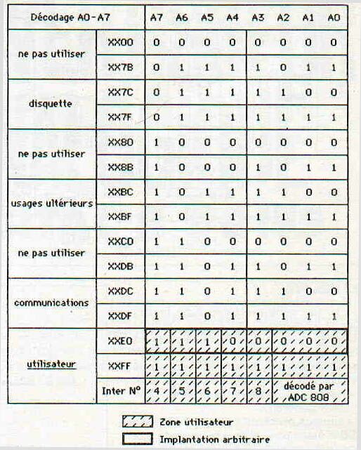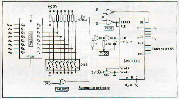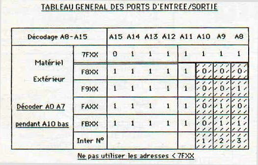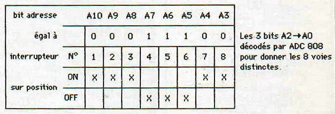 ADRESSAGE DU CONVERTISSEUR (voir schéma de principe) Pour AMSTRAD, les ports E/S disponibles se codent pendant A10 bas. Ils vont de F8XX à FBXX, le décodage des bits A15-A11, n'est donc pas nécessaire ( voir tableau de E/S ). Le décodage des bits A10 à A3 est confié a un comparateur 8 bits permettant ainsi de déplacer la carte du convertisseur sur toutes les adresses disponibles ( utilisables ! ), on ne sait jamais, il est très désagréable d'acheter deux périphériques se situant à la même adresse. Dans le montage, l'état des interruptions 1 à 8 détermine . - un 0 pour le bit d'adresse correspondant s'il est sur ON (a la masse), Ainsi, pour que le convertisseur soit pour les 8 voies de &F8E0 à &F8E7, il faut :