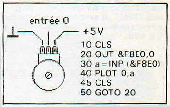 ETALONAGE Le potentiomètre 10 tours permet de fixer Vref + de 0 ( pas intéressant ) à 5 V, ainsi, la tension mesurée à la broche n° 12 de l'ADC ( Vref + ) sera traduite en 255 en digital ( valeur la plus haute ) MISE EN SERVICE A la fois comme exemple d'application et pour vérifier le bon fonctionnement de votre convertiseur et après avoir adressé votre convertisseur à l'adresse &F8E0 à &F8E7 et étalonné celui-ci sur 5 V reliez un potentiomètre de 50 k lin de la façon suivante à votre connvertisseur et tapez