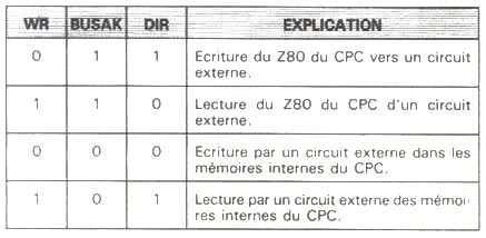 La sélection pour les accès à des ROM ou des RAM externes se fat par la combinaison des signaux ROMDIS et ROMEN à travers un OU. Le signal ROMDIS aura auparavant été inversé par le premier OU EXCLUSIF ; pour comprendre cet inverseur, se reporter à la table de vérité du OU EXCLUSIF ci-dessus. Une ROM externe signalera donc sa présence par un 1 ( + 5 volts ) sur l'entrée ROMDIS et pour que le buffer de données soit sélecte, il faudra ROMDIS à 1 et ROMEN à 0. Pour des problèmes de timing avec l'interface disque DDI1. le signal à la sortie du OU a été légèrement retardé par un circuit RC comprenant une résistance de 470 ohms et une capacité de 100 picofarads. La sélection d'une RAM externe ne se fera que par le RAMDIS ; cette RAM ne servira qu'au stockage de données car elle ne sera accessible en écriture que par un artifice. Toujours dans un souci de ne pas se limiter en réalisation, un autre Signal du Z80 a été utilisé pour sélectionner nos buffers. C'est le Signal BUSAK. Ce signal est fourni par le Z80 et indique que ses bus ont été mis dans l'état haute impédance ; ce signal est positionné par le Z80 après qu'une demande d'accès au bus ait été formulée par un circuit extérieur ( microprocesseur controleur de DMA ou autre ) , cette demande déccés étant un niveau 0 sur la broche BUSRQ du Z80. Le signal BUSAK indique donc quand il est à 0 volt et, dans ce cas , changera le sens des buffer des signaux d'adresses et des signaux de commandes ( broche dir des 74LS245, broche 1 ).