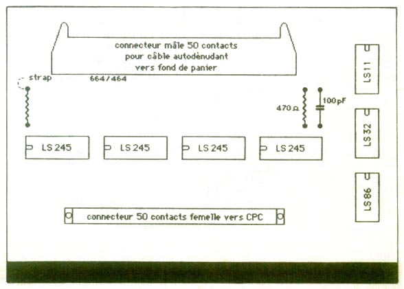 De même, pour les données, les sens de lecture et d'écriture seront inversés suivant que le microprocesseur sera celui du CPC ou un microprocesseur externe. Pour modifier le sens des données, nous avons utilisé un OU EXCLUSIF, ce qui donne le fonctionnement suivant la figure 2. Le connecteur 50 broches la reliant à l'AMSTRAD est un connecteur pour circuit imprimé embase femelle à souder sur carte au pas de 2,54 , par exemple un SOURIAU HE901 E 50 Y. La liaison entre l'interface et le fond de panier se fait par un câble plat à 50 conducteurs ; l'embase de sortie sur la carte est donc une embase mâle à 50 contacts avec ou sans verrouilleur pour système câbles/connecteurs auto-dénudants. LE FOND DE PANIER Regardons maintenant le fond de panier. Il comprend une embase mâle 50 contacts identique à l'embase mâle de l'interface, ce qui permet de les relier par un câble auiodénudant. Il comprend aussi 4 connecteurs devant recevoir les réalisations à venir et un connecteur plat en circuit imprimé qui recevra l'interface pour les possesseurs d'un 464 avec interface DDI1. Nous avons choisi pour les connecteurs chargés de recevoir les réalisations un format supérieur au bus d'expansion de l'AMSTRAD, soit 62 contacts et ce afin de pouvoir relier certaines cartes d'extensions directement entre elles et de pouvoir aussi les alimenter en multitension comme + 12 V et -12 V. Les connecteurs d'extension respectent le même brochage que le bus d'expansion de l'AMSTRAD et ce, bien sûr, sur les 50 premières broches. Une seule remarque : ATTENTION au sens de la nappa lorsque vous la presserez. Pour l'instant, nous ne vous donnerons pas un schéma d'alimentation, celles-ci se trouvent facilement en kit pour des prix très raisonnables. Notons que l'alimentation de l'AMSTRAD n'est pas utilisée pour alimenter les montages branchés sur le fond de panier, mais il est toujours possible de la dériver par un strap vers le fond de panier. Pour chaque montage, nous vous donnerons sa consommation approximative. Denis BOURQUIN , CPC n°4 - Octobre 85