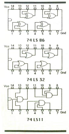 ANALYSE DU SCHEMA Nous ne reparlerons pas des buffers 74LS245 dont la table de vérité et le schéma avaient été donnés dans le numéro précédent , mais nous analyserons le schéma de commande du buffer de données. Nous trouvons un 74LS11 qui est un triple ET à trois entrées. Le premier de ces ET sert à la sélection de notre interface pour les entrées-sorties dont le bit A13 et le bit A10 sont à zéro. Ces deux signaux étant combinés avec le signal 10HQ du microprocesseur dans le premier OU du 74LS32, qui est un quadruple OU à deux entrées, notre buffer sera donc sélectionné pour A13 = 0 et IORQ = 0 ou pour A10 = 0 et IORQ = 0 ; rappelons que la broche 19 du 74LS245 est valide pour un état 0. Nous allons rappeler les tables de vérité de ces circuits ( figure 8 ), leur brochage est donné en figure 9.
