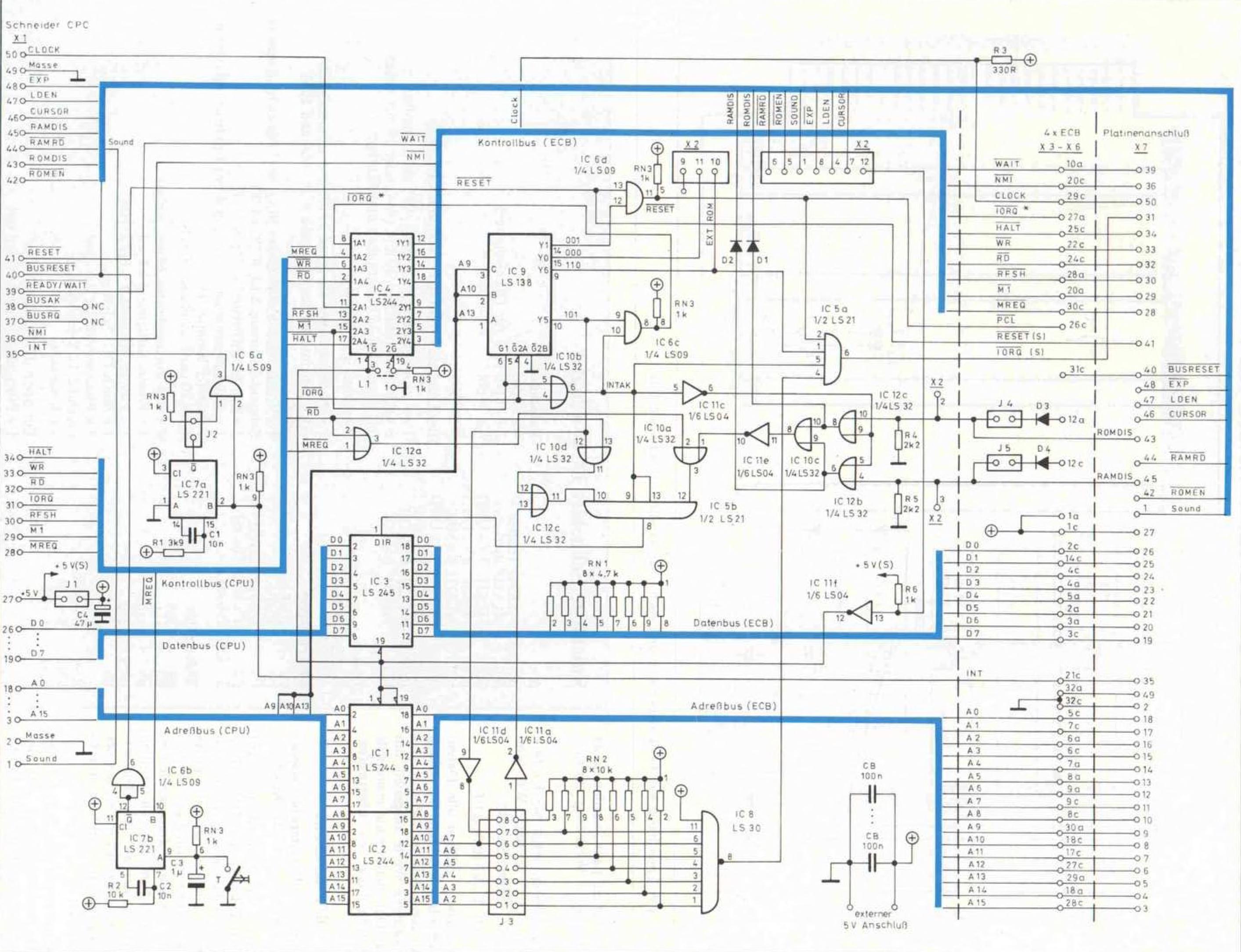 Es ist schon etwas Logikaufwand erforderlich, um dem Schneider alle Möglichkeiten des ECB-Bus zu erschließen und gleichzeitig weiterhin die Schneider-Peripherie zu bedienen.