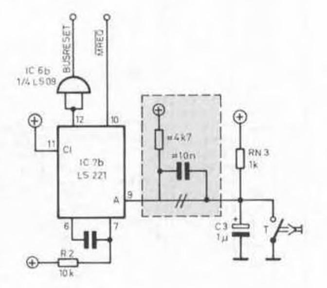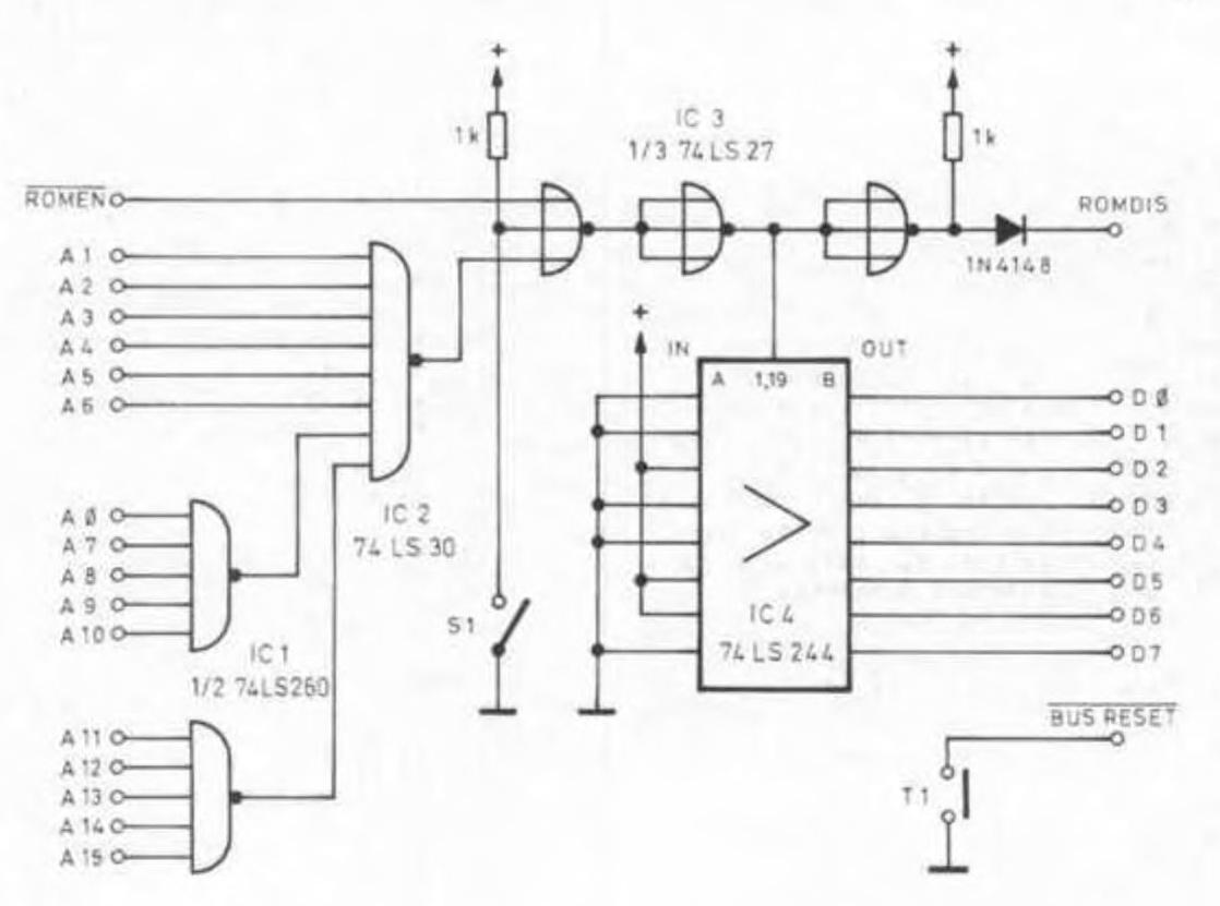 Die Schaltung selbst gestaltet sich einfach. IC1 und IC2 filtern die Adresse 7Eh aus. Mit IC3 wird das ROM ausgeblendet und der Bustreiber aktiviert. Wer Strom sparen möchte, sollte (neben HCT-Chips) bei der festen Verdrahtung mit einem Pull-up-Widerstand (etwa 4k7) an Plus gehen. Um das Ganze noch etwas komfortabler zu machen, wurde noch ein Schalter eingefügt. Mit diesem läßt sich der gesamte Umschaltmechanismus abschalten. ... und Erholung gewähren Der abgebildete Reset-Taster ist hier nur eine Primiliv-Lösung, da er keinerlei Rücksicht auf das CPU-Timing und den Refresh der dynamischen Speicher nimmt. Wird die CPU gerade in einem Schreibzyklus von einem Reset ‘überrascht', nimmt der aktuell adressierte Speicher eventuell Unsinn auf. Bei einer außer Kontrolle geratenen CPU muß man aber eh mit dem einen oder anderen zerstörten Byte rechnen, so daß es auf dieses eine Byte nicht unbedingt ankommt, und vielleicht hat man ja Glück ... Auf den Refresh kann der Benutzer aber selbst einwirken. Drückt er den Reset-Taster zu lange, so muß er eben mit umgekippten Speicherzellen rechnen, da in dieser Zeit keinerlei Refresh der dynamischen Speicherzellen stattfindet. Heutzutage halten diese Chips aber ganz schön lange durch (oftmals länger als eine Sekunde). Bei einem kurzen Tastendruck ist das Risiko also gering. Einen wesentlich sicheren Reset kann man durch eine Reset-Logik erreichen, wie sie ‘im Prinzip' auf dem c't-ECB-Anschluß vorhanden ist (timing-gerecht überein Monoflop). Allerdings hat man auch hier leider noch eine refresh-lose Zeit während der Druckdauer. Mit einer kleinen Änderung läßt sich das Problem aber beheben. Damit ist dann der Reset ‘nietund nagelfest'. Auf das LS09 kann mah normalerweise verzichten. Es ist nur nötig, falls von irgendwelchen Peripherie-Geräten ebenfalls ein Reset ausgelöst werden soll. Wer mit dem ECB-Adapter arbeitet. kann die Umblendschaltung bedenkenlos auf einer ECB-Bus-Platine unterbringen, da der Adapter die Signale ROMDIS und ROMEN für die Datenrichtung berücksichtigt und ROMDIS sogar über den Bus geführt werden kann.