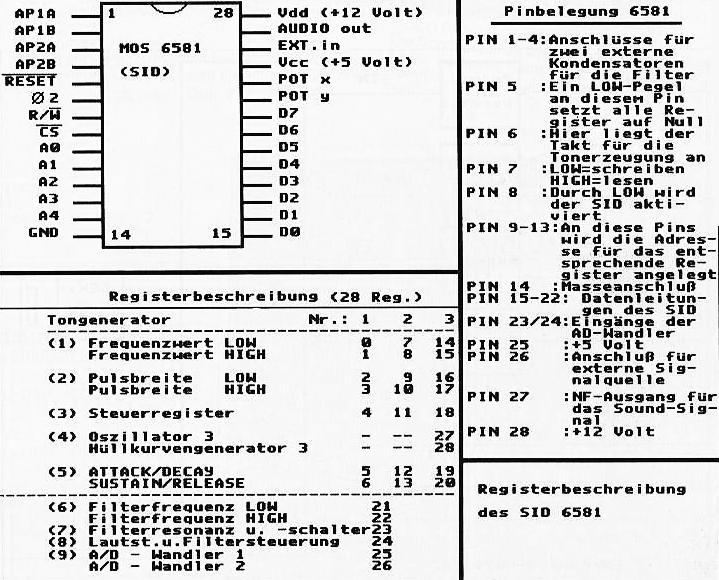 Bitte genau lesen: Zuvor ein paar allgemeine Bemerkungen, die jedoch sehr wichtig sind: Diese Bauanleitung ist vor allem für diejenigen gedacht, die schon Erfahrung im Bauen elektronischer Schaltungen haben, und denen die Arbeit mit dem Lötkolben leichtfällt. Deshalb haben wir auch bewußt auf den Abdruck eines Platinen-Layouts verzichtet, weil die Schaltung ohne Probleme auf einer Lochraster-Platine aufbaubar ist. Für diejenigen, die gerne ein Layout hätten, halten wir dieses bereit, es kann durch Zusendung eines frankierten Rückumschlages angefordert werden, die Schaltpläne werden ebenfalls mitgeliefert. Die Bauteile sind, bis auf den MOS6581, Standardbauteile und bei jedem Elektronikladen zu bekommen. Der MOS6581 ist dank der großen Verbreitung des C-64 ebenfalls bei vielen Firmen zu beziehen, einige haben wir am Ende des Textes zusammengestellt. Und nun wünschen wir Ihnen viel Vergnügen beim Bau Ihres 'Soundwunders'.