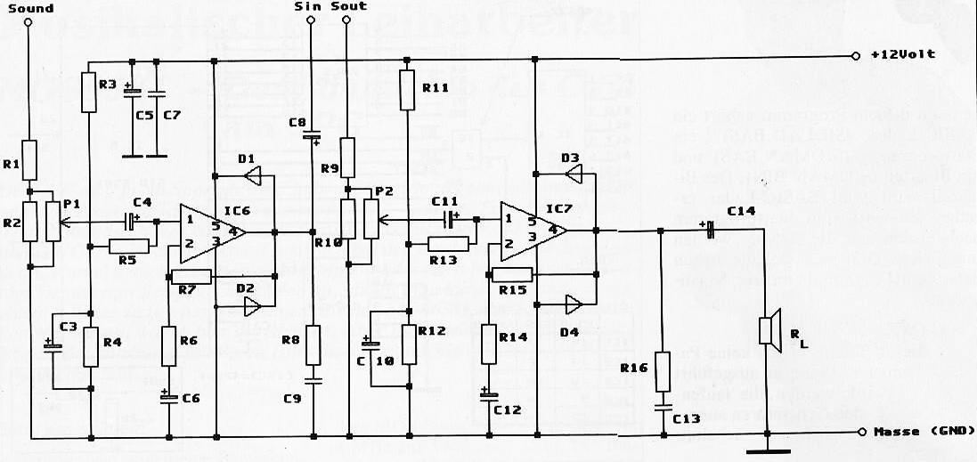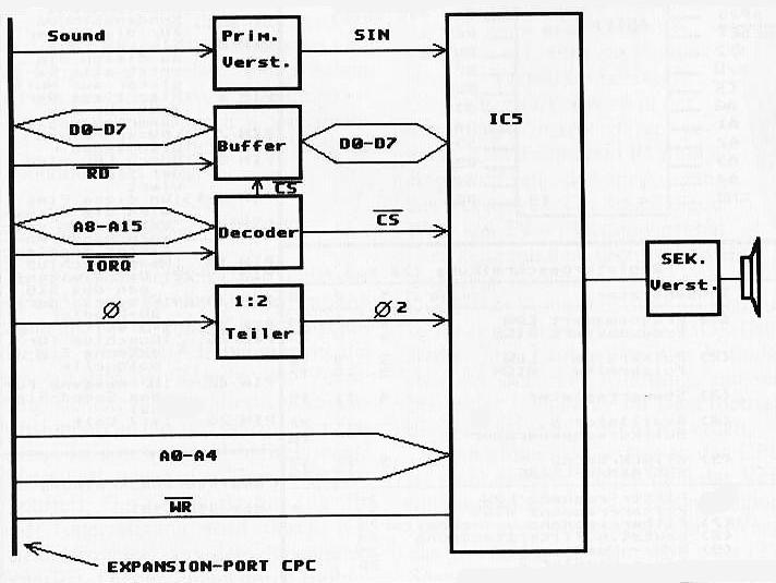 Der Aufbau der Schaltung Das Herzstück der Schaltung bildet der MOS6581, der für die Klangerzeugung zuständig ist. Er enthält drei Tongeneratoren. Die fünf Adreßleitungen, die zur Auswahl der Register zur Verfügung stehen, werden direkt vom Expansionport an das IC5 gelegt. Der Datenbus ist durch IC3 (8 bidirektionale Bustreiber) gegen den Expansionport gepuffert. Der Grundtakt für Zugriffe und Tonerzeugung wird durch IC4 (Dekadenzähler) aus dem Systemtakt generiert. Dies geschieht durch Halbierung der Frequenz. Das bedeutet, daß dem MOS-Baustein eine Frequenz von 4 MHz zur Verfügung steht. Die Bausteinauswahl durch den Computer, also die Erzeugung des Chip-Select-Si-gnals, wird von IC1 (achtfach NAND-Gatter) und IC2 (4 OR-Gatter) übernommen. Am NAND-Gatter liegt der obere Adreßbus an. Das bedeutet, wenn an die Adresse &FFxx ein Zugriff erfolgt, wird der Ausgang LOW. Da der CS allerdings nur bei einem IO-Zugriff wirksam werden soll, wird der Ausgang des NAND-Gatters über ein OR-Gatter mit dem IO-Request Signal gekoppelt. Der MOS-Baustein kann ein externes Signal verarbeiten, durch Filter beeinflussen und seine Lautstärke bestimmen. Deshalb wird das Soundsignal vom CPC-eigenen Generator an den entsprechenden Eingang gekoppelt. Da allerdings der Baustein ein sehr stark getriebenes Signal benötigt, wird zur Koppelung ein Verstärker benötigt. Dieser Verstärker wird in der Schaltung Primärverstärker genannt. Das Trimmpoti PI muß so eingestellt sein, daß am Ausgang des Verstärkers das Signal einen Wert von 2Vss (Spitzenwert) hat. Dies kann mit dem Oszilloskop eingemessen werden.