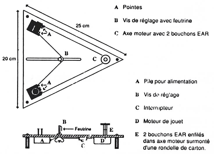 Quel que soit le mode de fixation et la nature du matériel de récupération utilisés, il faut que l'axe du moteur émerge du socle d'environ 4 cm. Enfilez dans cet axe les deux bouchons EAR et fixez par dessus une rondelle de carton d'un diamètre sensiblemement supérieur (afin d'empêcher le ruban de s'échapper lors du fonctionnement). Il est impératif d'utiliser une colle très forte pour fixer ensemble : axe, bouchons et rondelle. Profitez-en pour coller le morceau de feutrine sur la vis de réglage. Fixez sur le dessus du socle les pointes de callage (voir schéma) et placez votre ruban anémique. L'appareil est fin prêt. Le mode d'emploi Installez le ruban (s'inspirer du schéma) en lui faisant faire un tour complet autour de l'axe de rotation et tendez le correctement en jouant sur la vis de réglage. A la mise en route, il doit tourner sur lui-même