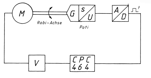 Achsen können zudem noch doppelt ausgeführt werden. So wir die Taillenachse oft in zwei Achsen - horizontale und vertikale Achsen zergliedert. Je mehr Achsen ein Roboter hat, um so präziser und schneller kann er eingesetzt werden. SCHNEIDERN-aktiv bietet seinem Leser einen besonderen Service: Der komplette Robo-terschalturlg mit Layout zur Platinenfertigung zum Ansteuern z.B. eines Fischer-Technik Roboters. Für den Leserser-vice ist bei genügender Nachfrage der komplette Bausatz mit fertiger Platine im Gespräch. SCHNEIDERN-aktiv sucht noch weitere Hard- und Software für den CPC Leserservice. Das Prinzip Das Schema Bild 1 erklärt die prinzipielle Funktionsweise des Roboters. Der Computer steht über ein geeignetes Interface mit dem Roboter in Verbindung. Bei diesem Interface handelt es sich um eine Parallelschnittstelle mit Ein- und Ausgängen. Der Schaltverstärker ‘V‘ verstärkt die Motorsteuersignale des Computers für Ein/Aus bzw. Links/Rechts-Drehung. Der Motor erhält dieses Signal und bewegt über ein Getriebe eine Achse des Roboters. Mit dieser Achse ist ein Potentiometer, je nach Bedarf über ein Getriebe, fest verbunden. Das Poti liefert uns eine variable Gleichspannung, je nach Stellung des Schleifers. Diese Spannung wird durch den A/D-Wandler in einen Impuls von bestimmter Länge umgewandelt. Über eine Zählschleife ist nun der Computer in der Lage die Länge dieses Impulses zu bestimmen und somit die Stellung der Roboterachse zu erkennen. Aus der dadurch gewonnenen Information bestimmt der Computer die weiteren Steuersignale für den Motor. Das brauchen wir Wir benötigen also folgende Komponenten für unseren Roboter:
