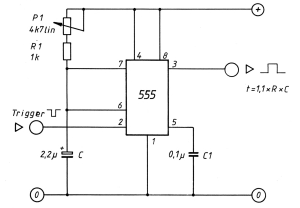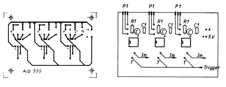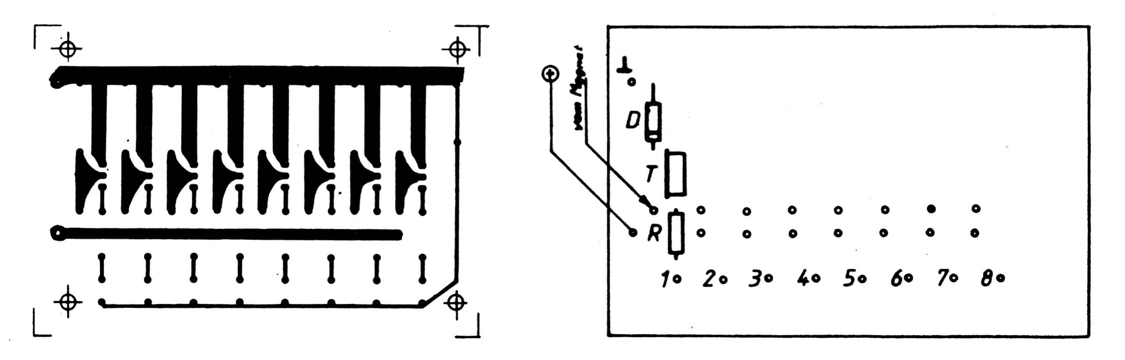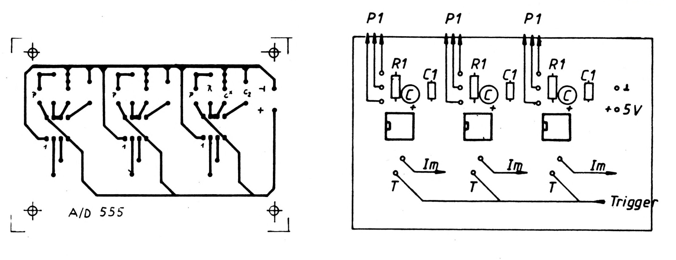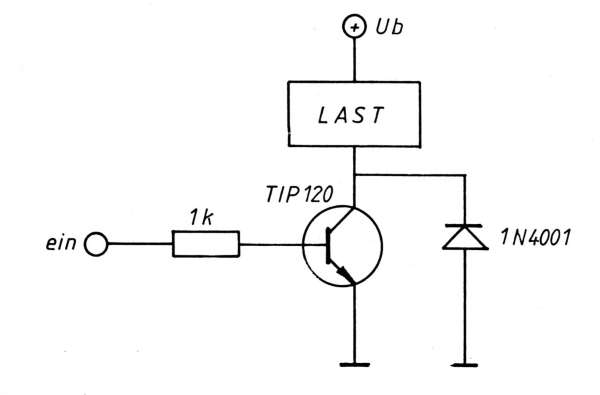 Der A/D-Wandler Ais A/D-Wandler (Bild 4) wird ein als Monoflop geschaltetes IC 555 verwendet. Durch den Triggereingang an Pin 2 wird das Monoflop gesetzt. Der Ausgang Pin 3 geht für eine bestimmte Zeit auf H-Pegel. Diese Zeit ist abhängig vom Kondensator CI und der Stellung des Potis. Die Impulsdauer ist nach der Formel t = 1.1 * R1 * C1 berechenbar. Die Triggerung wird durch einen Sprung von H-nach L-Pegel ausgelöst. Auf der Platine ist für drei dieser A/Ds Platz vorgesehen. Es müssen jedoch in unserem Fall vorerst nur 2 bestückt werden. Es ist auch noch eine einfache Transistorschaltstufe für Elektromagnete oder dgl. vorgesehen (Bild 5). Auf der Platine ist Platz für 8 Schaltstufen. Für unseren Roboter wird nur eine Schaltstufe für den Elektromagneten, der als einfacher Greifer für Münzen und dgl. verwendet wird, benötigt. Beschreibung des Programms Assemblerprogramm: Zunächst werden 9 Bytes reserviert. Sie werden im Programm folgendermaßen vewendet: A000 Sollwert Achse 1 Low-Byte Die Positionen können also nach der Formel P = Low-Byte + 256 * High-Byte berechnet werden. Ab Programmzeile 280 beginnt die Initialisierung der PIO. Dabei werden die Port A-Bits 0 bis 5 als Ausgänge und die Bits 6 und 7 als Eingänge definiert. Der Port A ist also folgendermaßen mit dem Robi verbunden: Bit 0 Motor 1 links Nach der Initialisierung wird der Trigger Ausgang noch auf H gesetzt, danach folgt der Sprung ins Hauptprogramm. Im Anschluß an die Initialisierung folgen ab Zeile 430 bis 740 die beiden Unterprogramme für die Abfrage der A/D-Wandler. Dabei wird zunächst der Triggerimpuls ausgegeben und danach in einer Zählschleife das Register HL erhöht, solange der Ausgangsimpuls des A/D-Wandlers andauert. Um korrekte Werte zu erhalten, müssen zuvor die Interrupts des Betriebssystems gesperrt werden. Im Register HL ist somit der aktuelle Positions-Istwert der jeweiligen Achse gespeichert. Mit dieser Information erfolgt die Rückkehr ins Hauptprogramm.