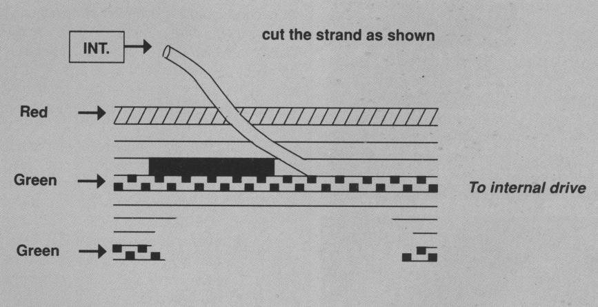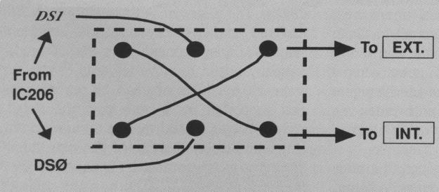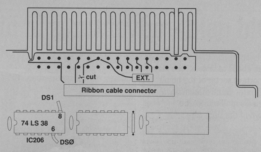 The motherboard diagram doesn't show every jot and tittle but has more than enough to do the job accurately. The ribbon cable diagram represents part of the internal disk drive cable and the red edge is indicated. .The 4th (grey) strand should be cut as indicated, and the end nearest the internal drive [INT] should be connected to the switch as shown. Opposite corners of the switch should be connected together and a wire, taken from the pin marked [EXT], should be soldered to the hole indicated on the motherboard diagram. The existing printed circuit track from that hole should be cut. The centre pins on the switch connect to pin 6 (DSO) and pin 8 (DS1) of IC206. Wires can be soldered straight onto the IC's pins but don't take more than about five seconds with the iron on each pin. And that's all there is to it. Follow the diagrams carefully, eat up all your greens and allow plenty of wire inside the computer to the switch, so that it can be opened freely. •