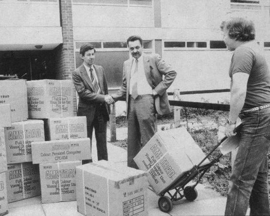 Amstrad sales director, Dickie Mould, provides a personal delivery service for the first CPC464 systems to enter the educational system. CPC464 USER (8/1984)
